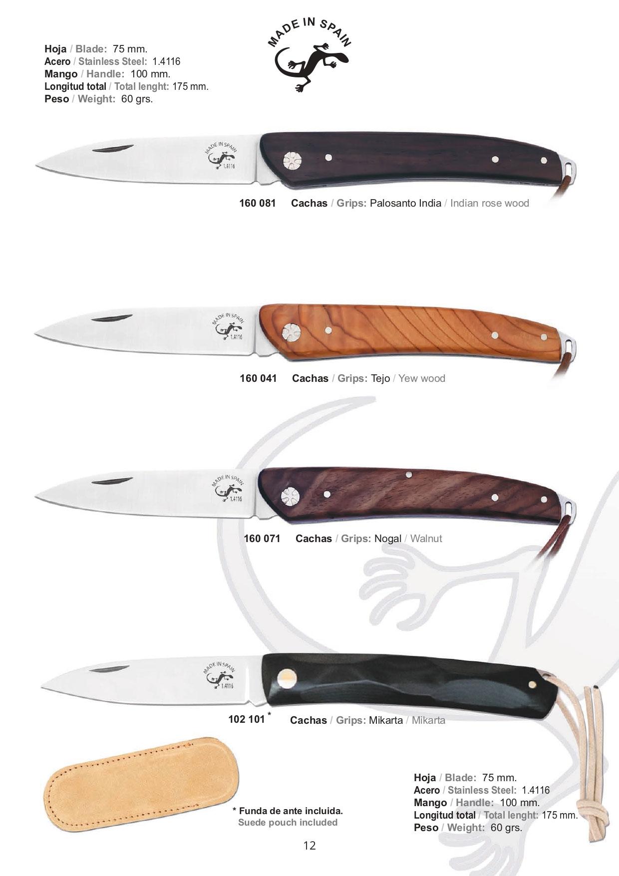 Lâmina de aço de 7,5 cm 1.4116. Cabo de 10 cm. Comprimento aberto: 17,5 cm. Peso: 60 gr.