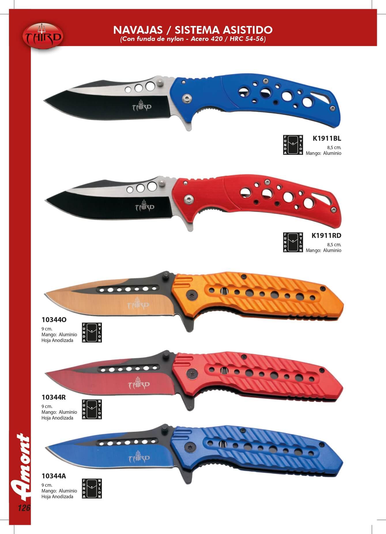Lâmina: aço 420 / HRC 54-56. comprimento da lâmina: 8,5 e 9 cm. Alça de alumínio Com sistema assistido. Inclui bainha de nylon.
