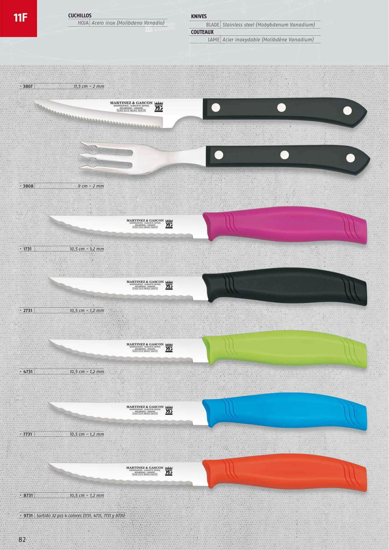 Facas de mesa com serra com cabos de cores diferentes.