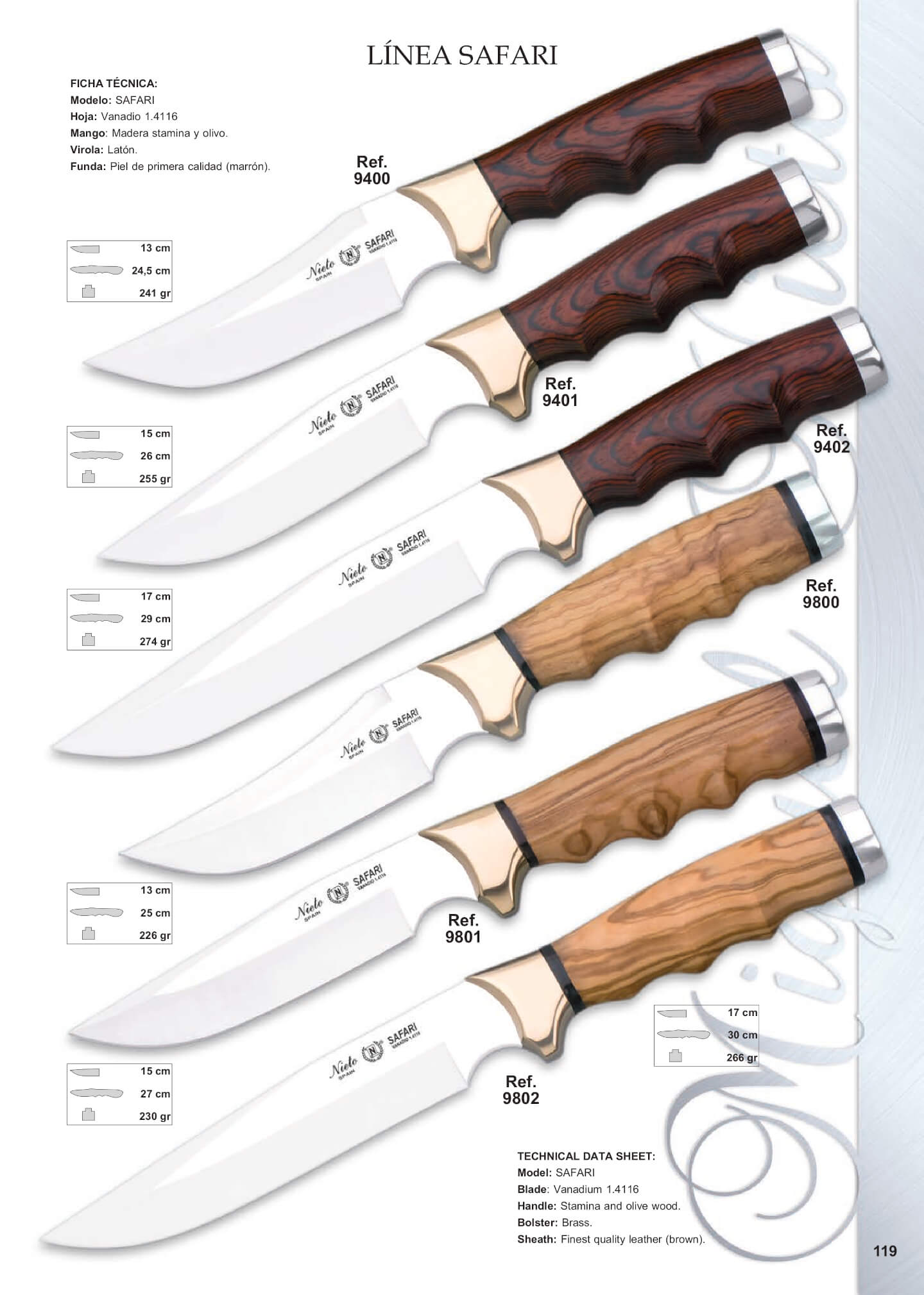 Lâmina de aço Vanadio 1.4116. Cabo de madeira natural de resistência ou de oliva. Cobrir de pele de primeiro qualidade (marrom). Virola de bronze e alpaca