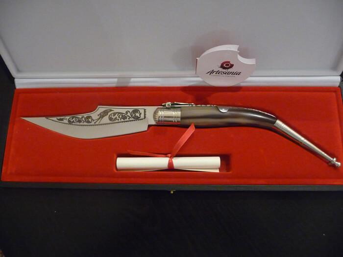 Pocket coleção da faca. 440 aço gravada lâmina de 15 cm. Comprimento total 33,5 cm. Virola e alpaca recesso alça de Cebu.