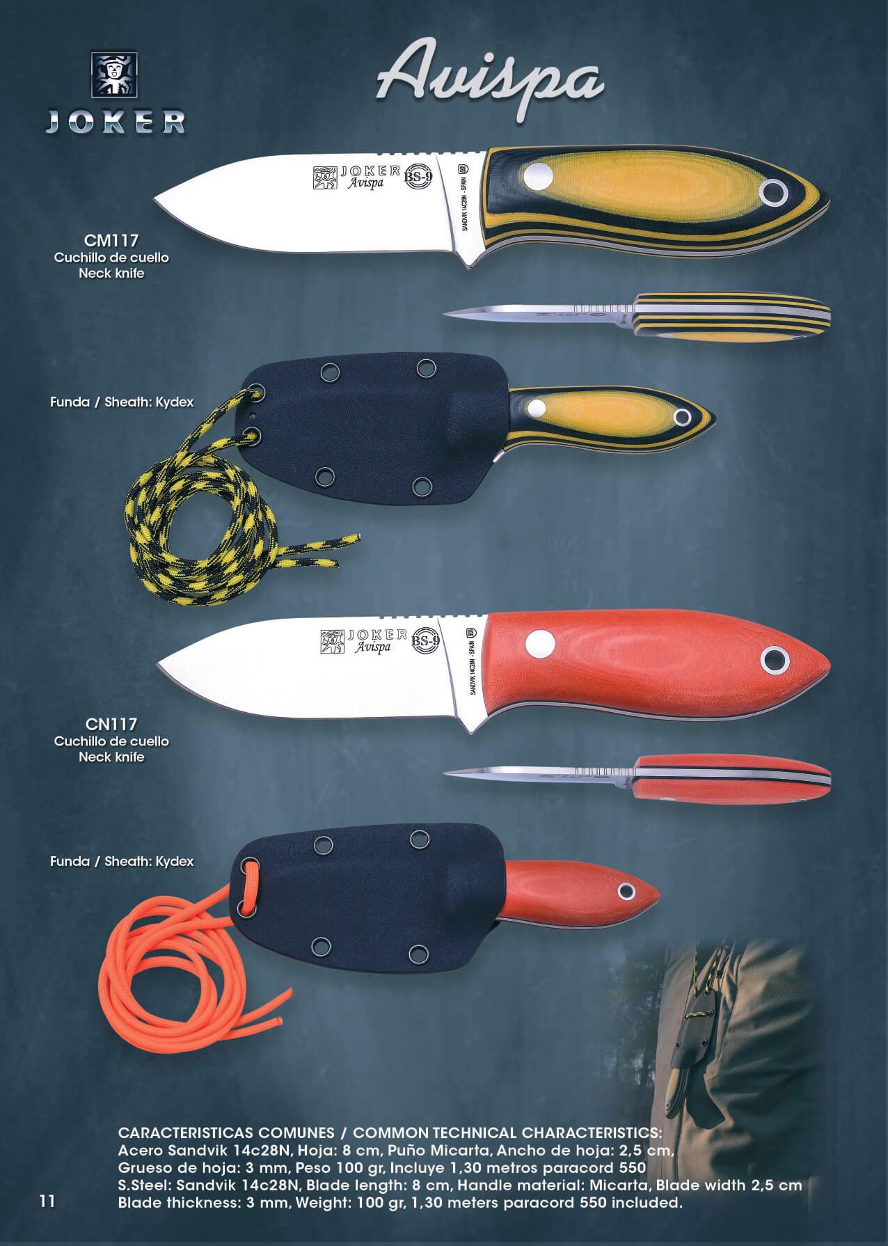 Facas de pescoço BS9 Joker Avispa com lâmina de aço Sandvik 14C28N, espessura de 2,7 mm e 1,3 metros de paracord.