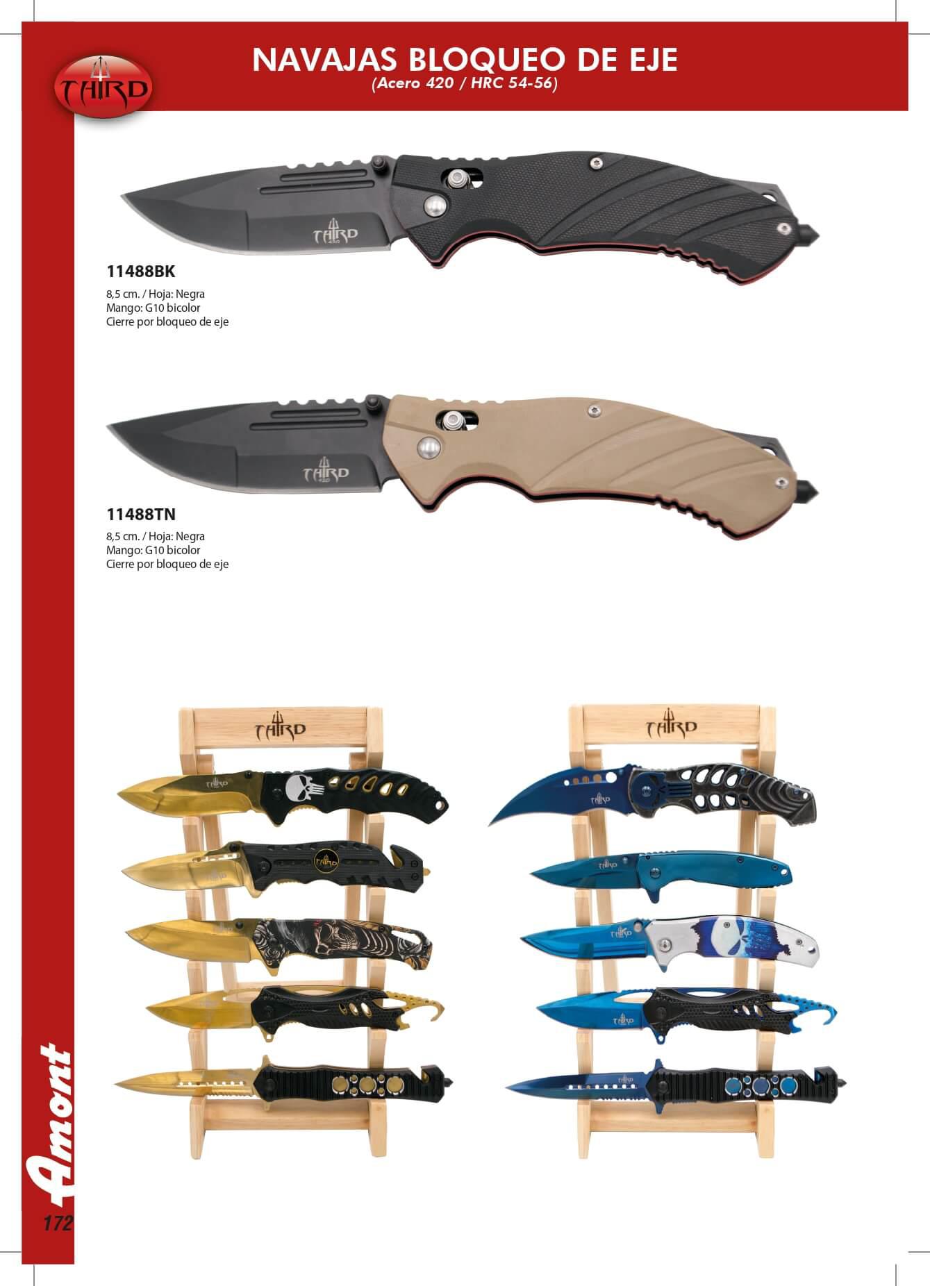 - 11488: cabo G10 bicolor preto com base vermelha, lâmina em aço inox 420 de 8,5 cm, mecanismo de travamento do eixo. Espessura da lâmina: 2,9 mm. Cortando cm: 8 cm. Comprimento do cabo: 13 cm. Comprimento total: 21,5 cm. Peso: 135 gr