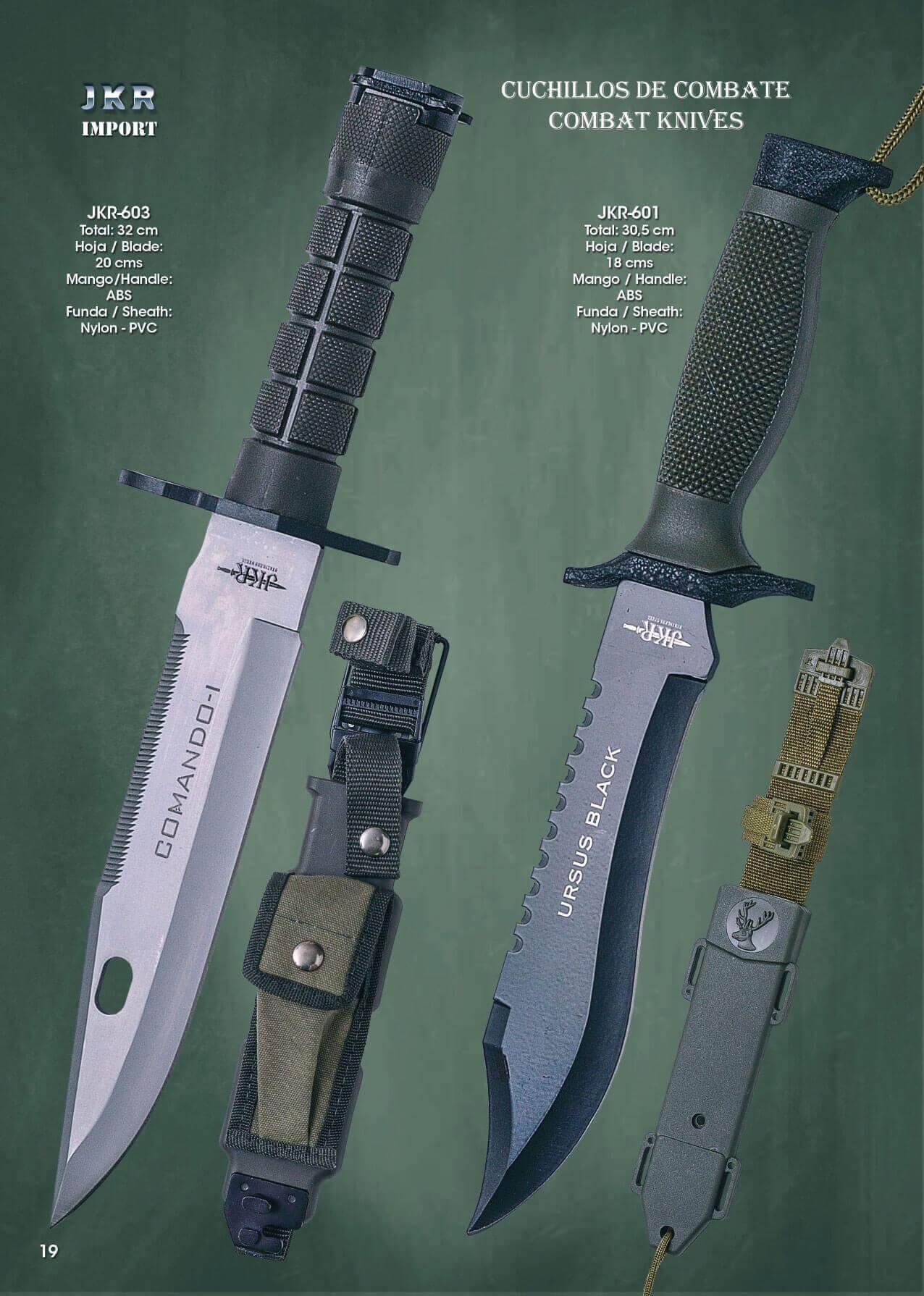 JKR-603: Commando faca I, com lâmina de 20 cm, comprimento total de 32 cm, cabo de ABS e bainha de Nylon e PVC.