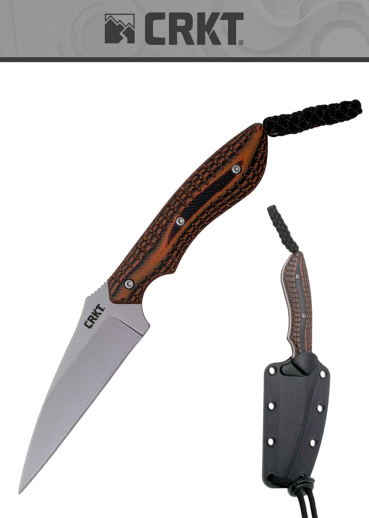 158,75 milímetros no total. Lâmina Wharncliffe inoxidável 5Cr15MoV com acabamento a jato de esferas de 76,63 mm. Punho G10 preto e castanho. Espiga cheia. Cordão de pescoço de cordão preto. Embalado com clipe que pode ser anexado à bainha para transporte no bolso. Bainha de pescoço preta.