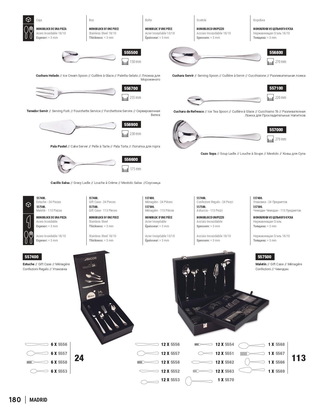 Talheres, 113 peças. Em aço inoxidável. Monobloco em uma peça. Apresentado em uma maleta. Modelo de Madrid.