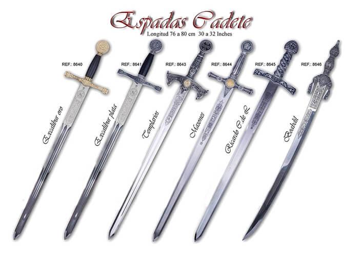 Espadas Cadete: Excalibur ouro, prata Excalibur, Templários, Maçons, Ricardo Coração de Leão e Boabdil.