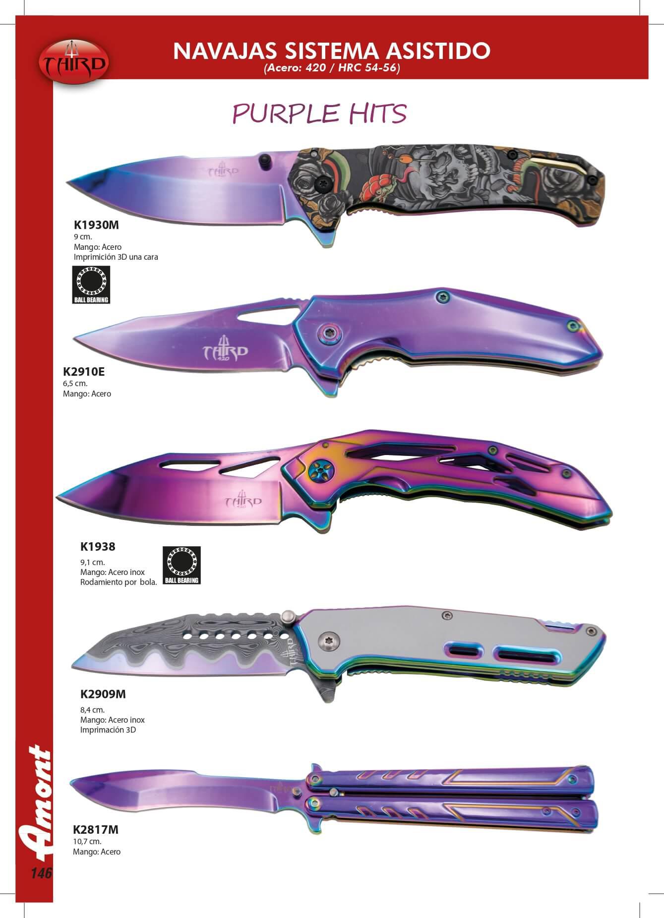 Facas com sistema de abertura assistida. PURPLE HITS. Cabo de aço. Chapa de aço 420.