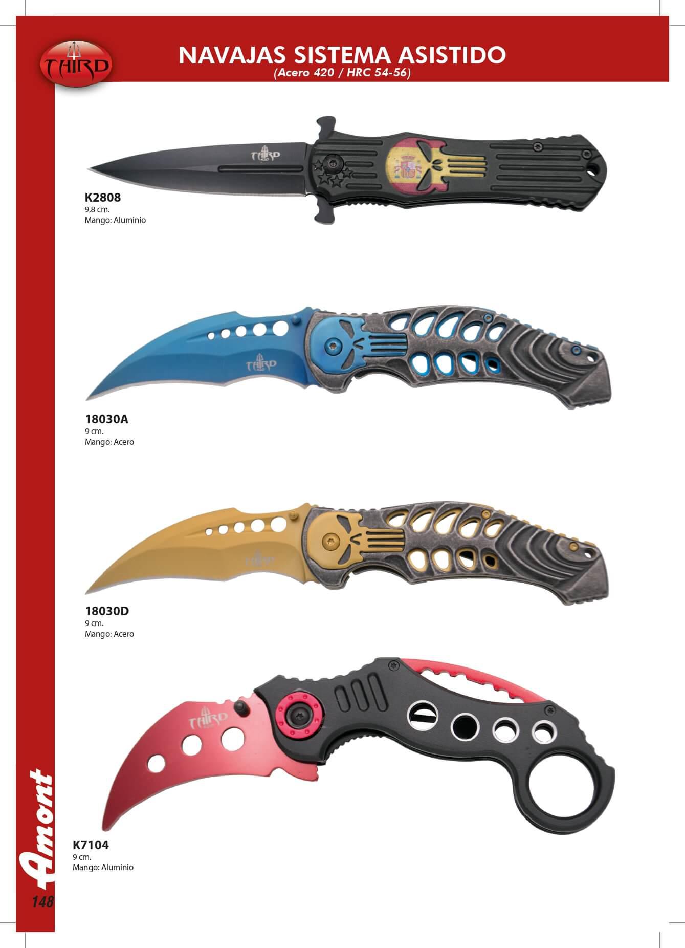 Facas com sistema de abertura assistida. K2808 Folha de 8,5 cm. Punho: alumínio 18030A Folha: 9 cm Lidar com: aço 18030D Folha: 9 cm Lidar com: aço