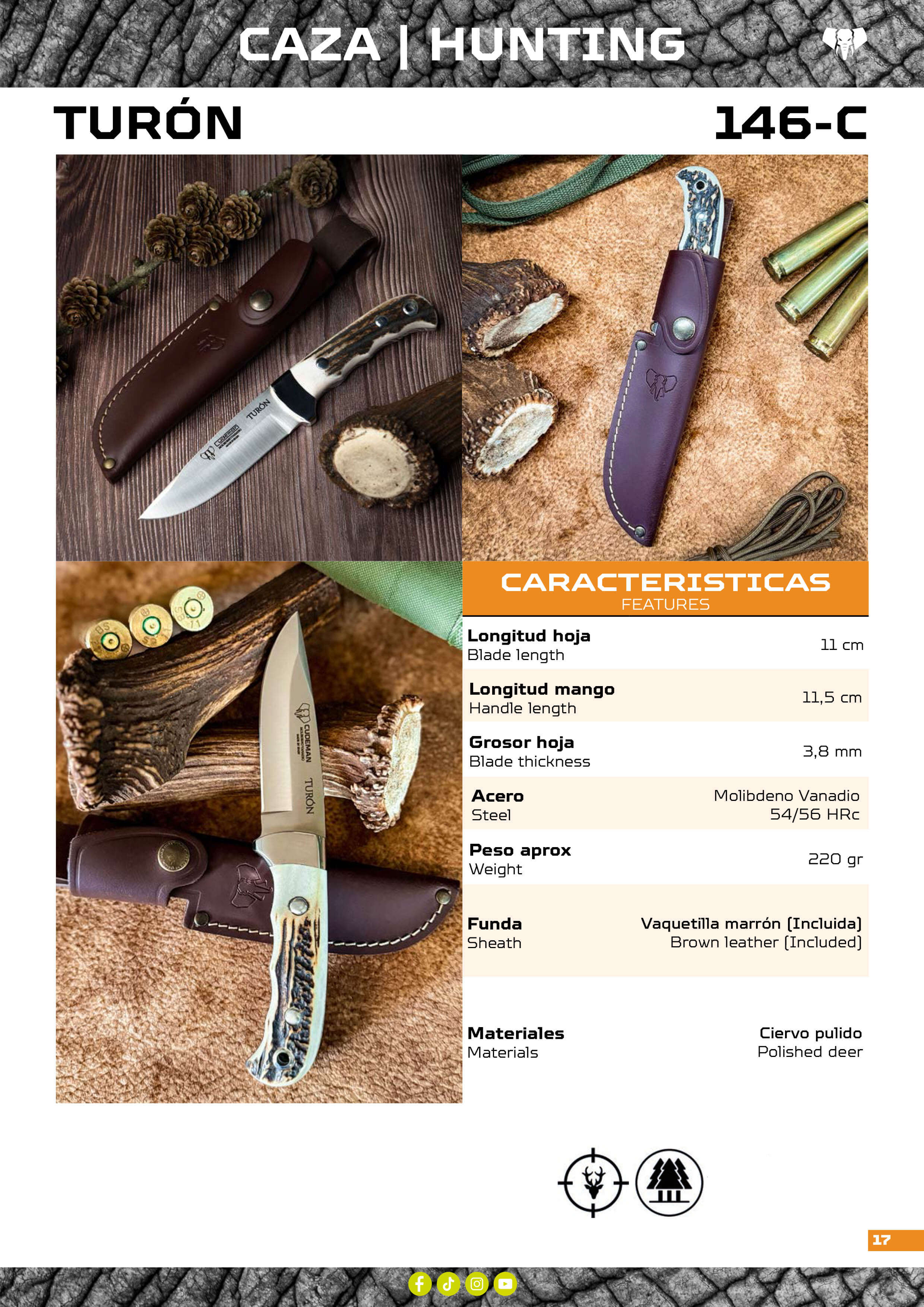 146 Faca completa com lâmina de aço de molibdênio Vanadio e ponteira de aço inoxidável A-304. Comprimento da lâmina: 11 cm. Comprimento total: 22,5 cm. Espessura da lâmina: 3.8 mm Largura da pá: 3 cm. Estojo de couro marrom