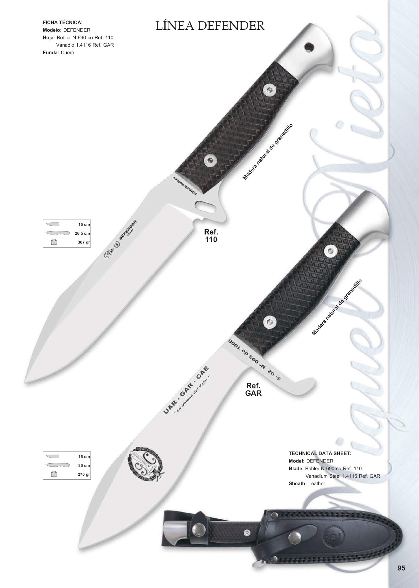 Facas Nieto Defender.Facas militares inteiriças com lâmina de 15 cm de comprimento e bainha de couro preto.