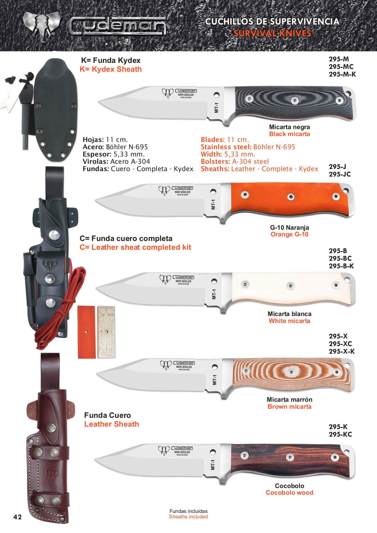 Facas completas com escamas de mikarta de cores diferentes, madeira G10 laranja ou cocobolo. Comprimento da lâmina: 11 cm. Comprimento total: 22,5 cm. Espessura da lâmina: 5.33mm. Chapas de aço Böhler N695 / MOVA. Ponteiras de aço A-304.
