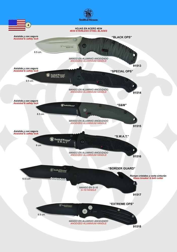 Facas com lâminas de aço 4034 e alça de alumínio anodizado.