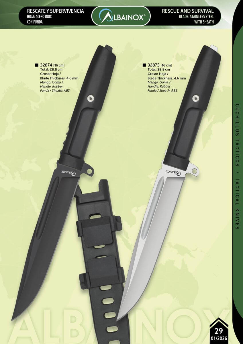 Faca tática preta com cabo emborrachado e lâmina de 16 cm.