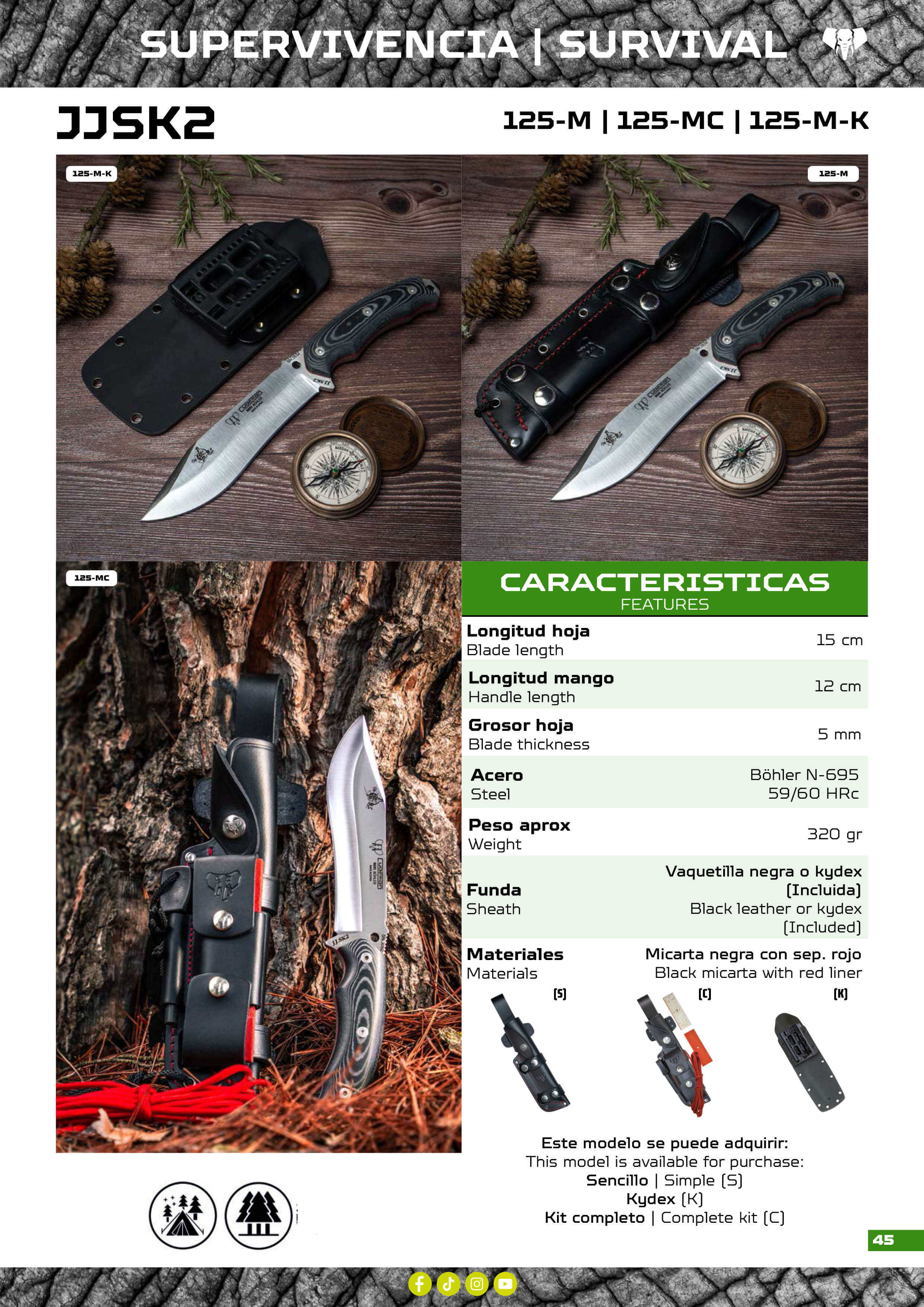 Facas de sobrevivência Cudeman JJSK2, aço Böhler MOVA ou N-695, Micarta manusear e vários acessórios para a sobrevivência. Cujos modelos de referência é terminado em C tem um mais completo do que o outro kit referências sobrevivência.