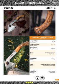 Machado de caça com lâmina de 21 cm e cabo em madeira de oliveira. Inclui bainha castanha.