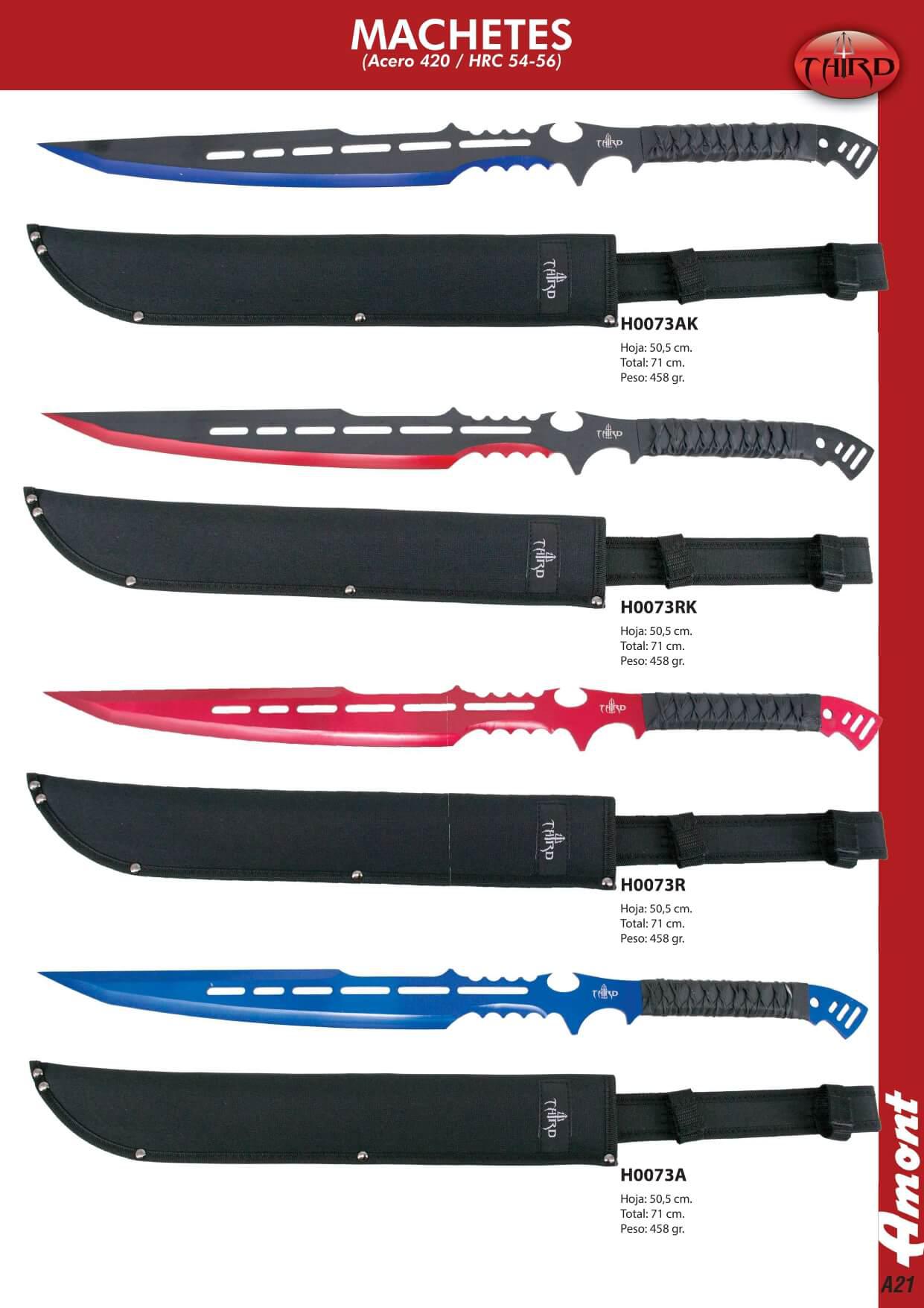 Machetes com lâmina de aço 420 com 50,5 cm de comprimento. Punho de cordão preto e bainha de nylon.