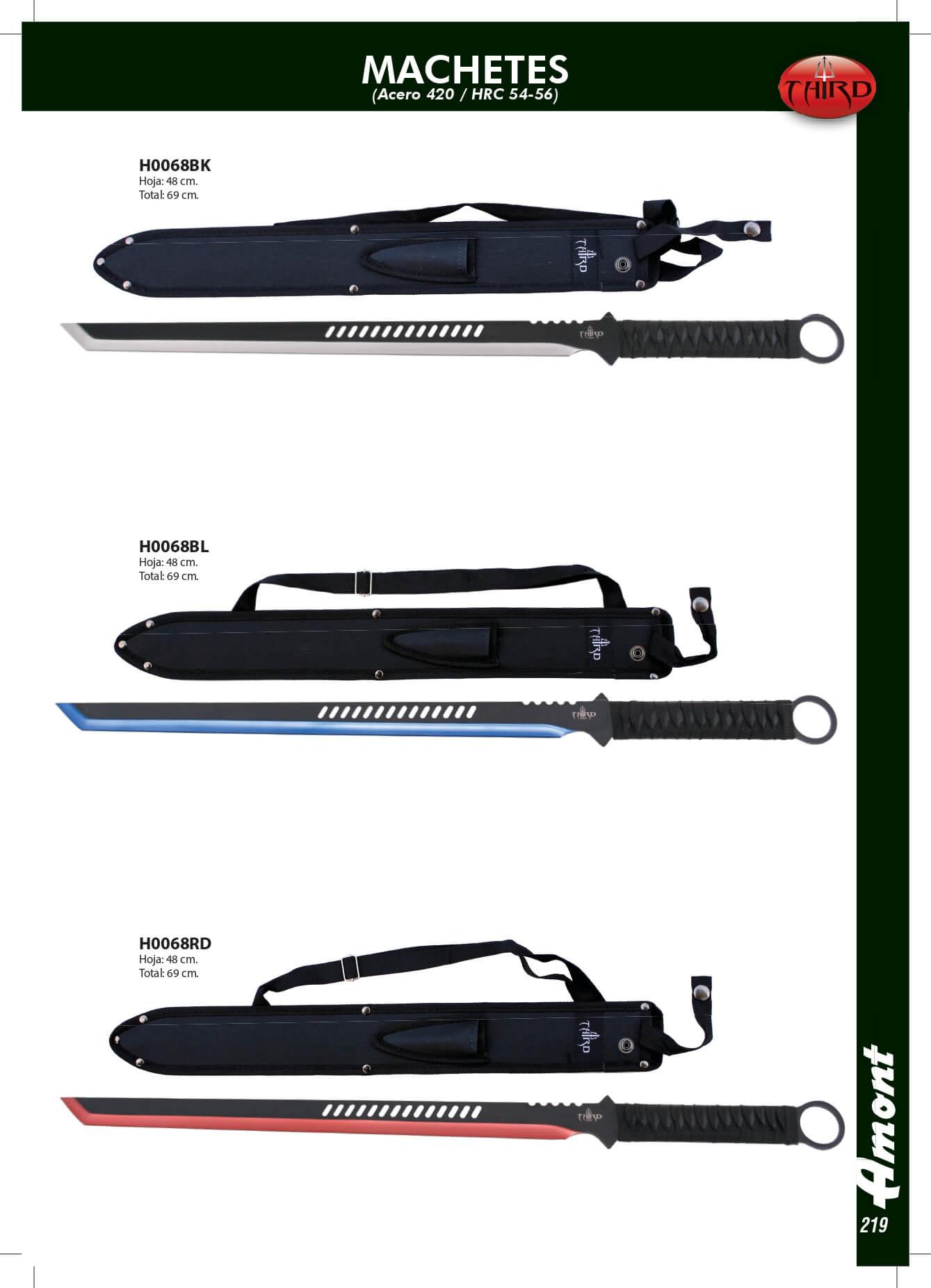 Machete. Aço 420. HRC 54-56. H0068BK Comprimento da folha: 48 cm. Comprimento total: 69 cm. H0068BL Comprimento da folha: 48 cm. Comprimento total: 69 cm. H0068RD Comprimento da folha: 48 cm. Comprimento total: 69 cm.
