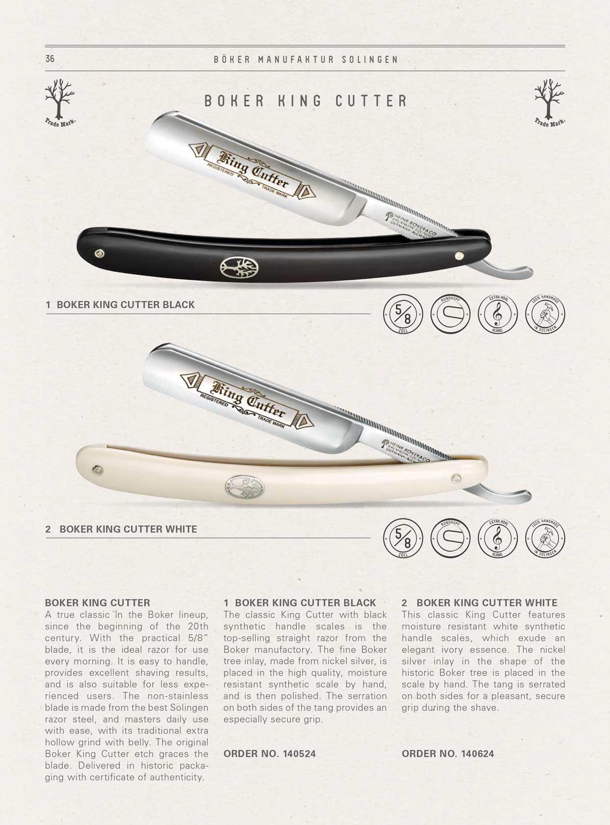 O King Cutter era parte integrante da gama de máquinas de barbear Boker no início do século XX. Com sua lâmina prática 5/8 ", é a lâmina ideal para todas as manhãs, fácil de usar e com muito bom resultado de barbear, mesmo para o usuário inexperiente. A lâmina inoxidável é feita do melhor aço para barbear Solingen . A lâmina é feita à mão com um gume extra oco. Inclui o autêntico carimbo Böker no passo da lâmina.