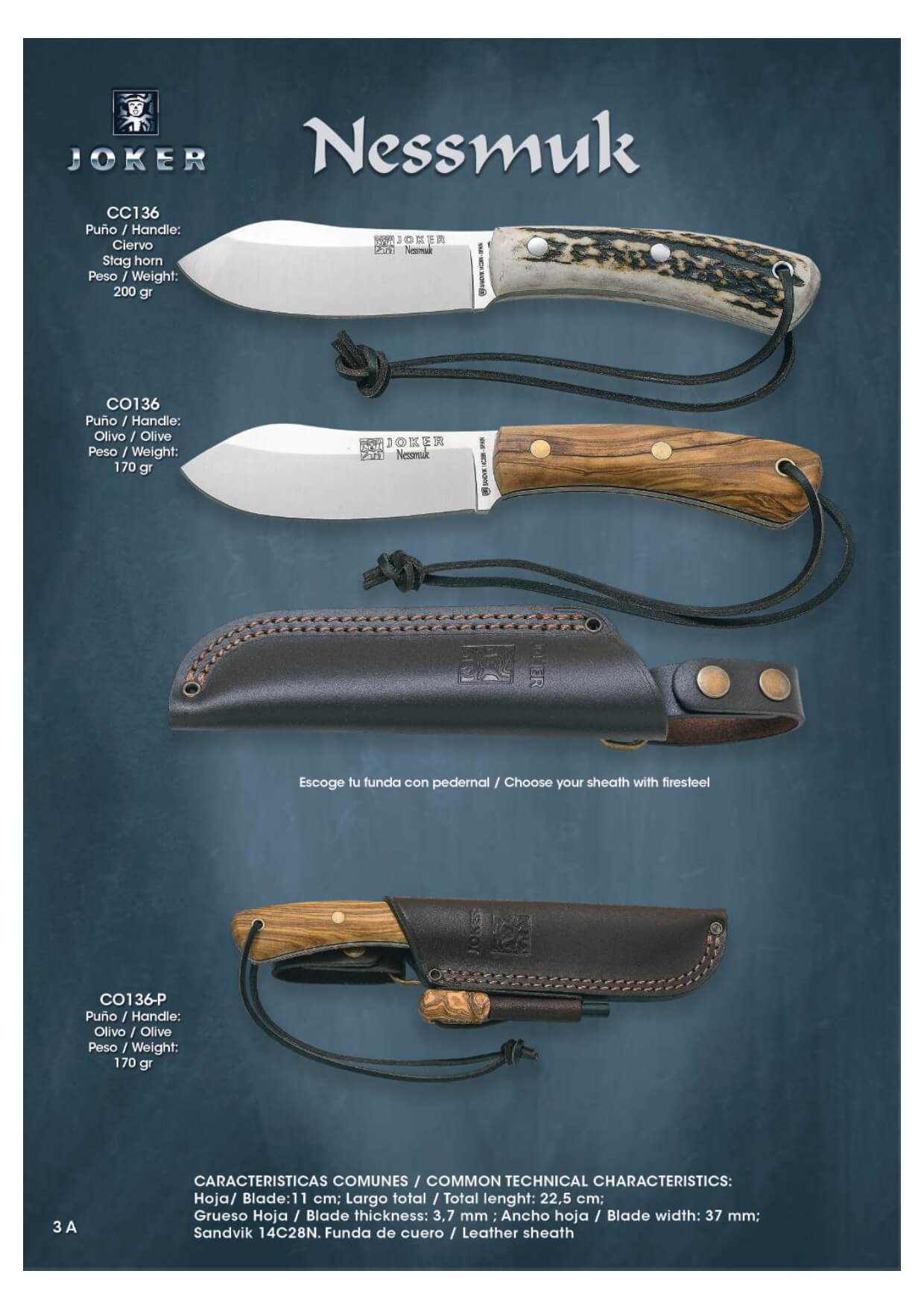 Lâmina em aço Sandvick 14C28N de 11 cm. CC136: Corno de veado Nessmuk. CC136-P: Corno de veado Nessmuk. CO136: Madeira de oliveira Nessmuk CO136-P: Madeira de oliveira Nessmuk com sílex.