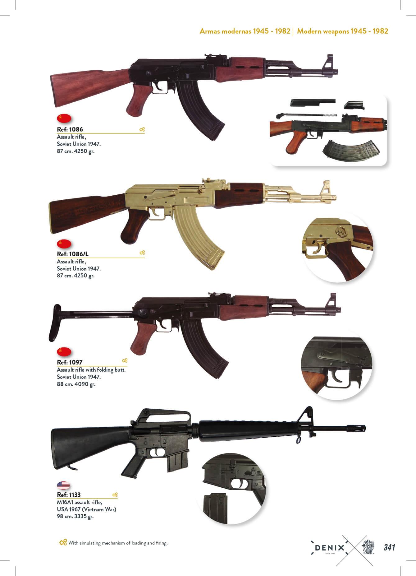 Metralhadoras e espingardas com mecanismo de carga e simulação de disparo.