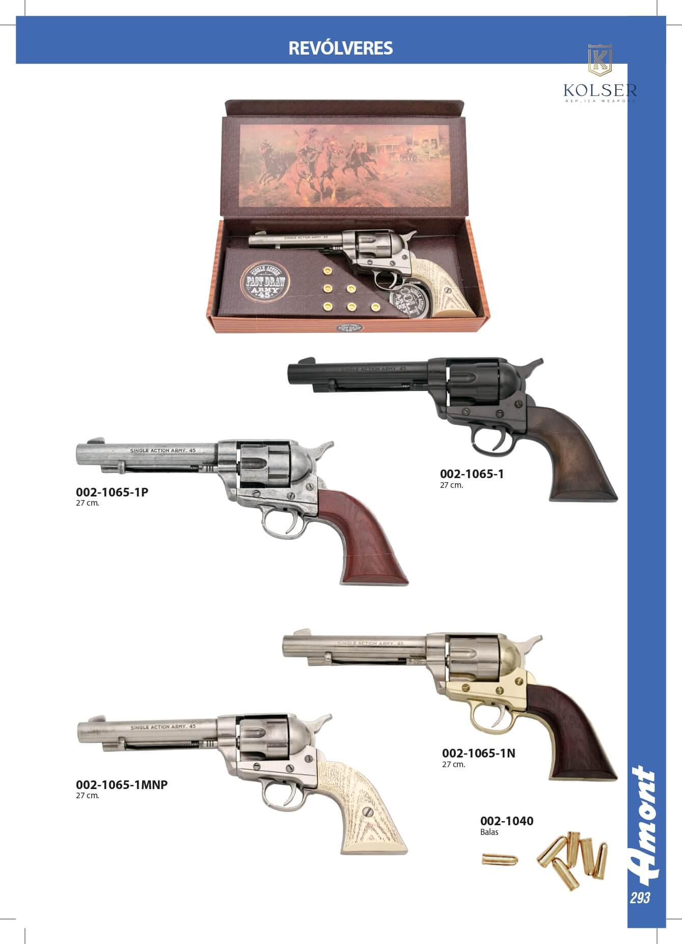 002-1065-1P: Pistola revólver Peacemaker na cor cinza, com cabo na cor madeira, com caixa de apresentação com 6 balas