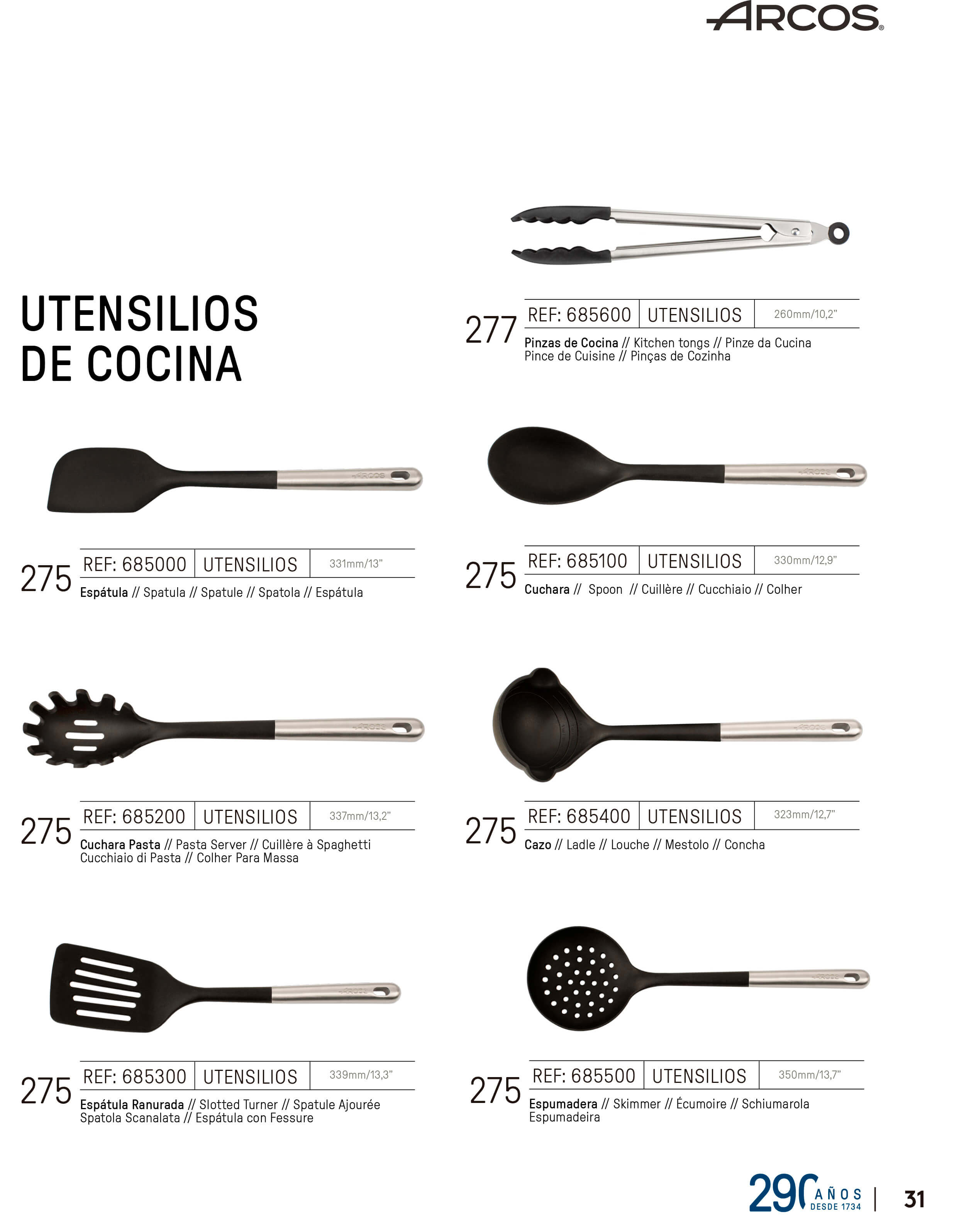 Inclui uma pinça de cozinha, uma espátula, uma colher, uma colher para massas, uma concha, uma espátula com fenda e uma escumadeira. Todas elas são feitas de aço inoxidável e silicone.