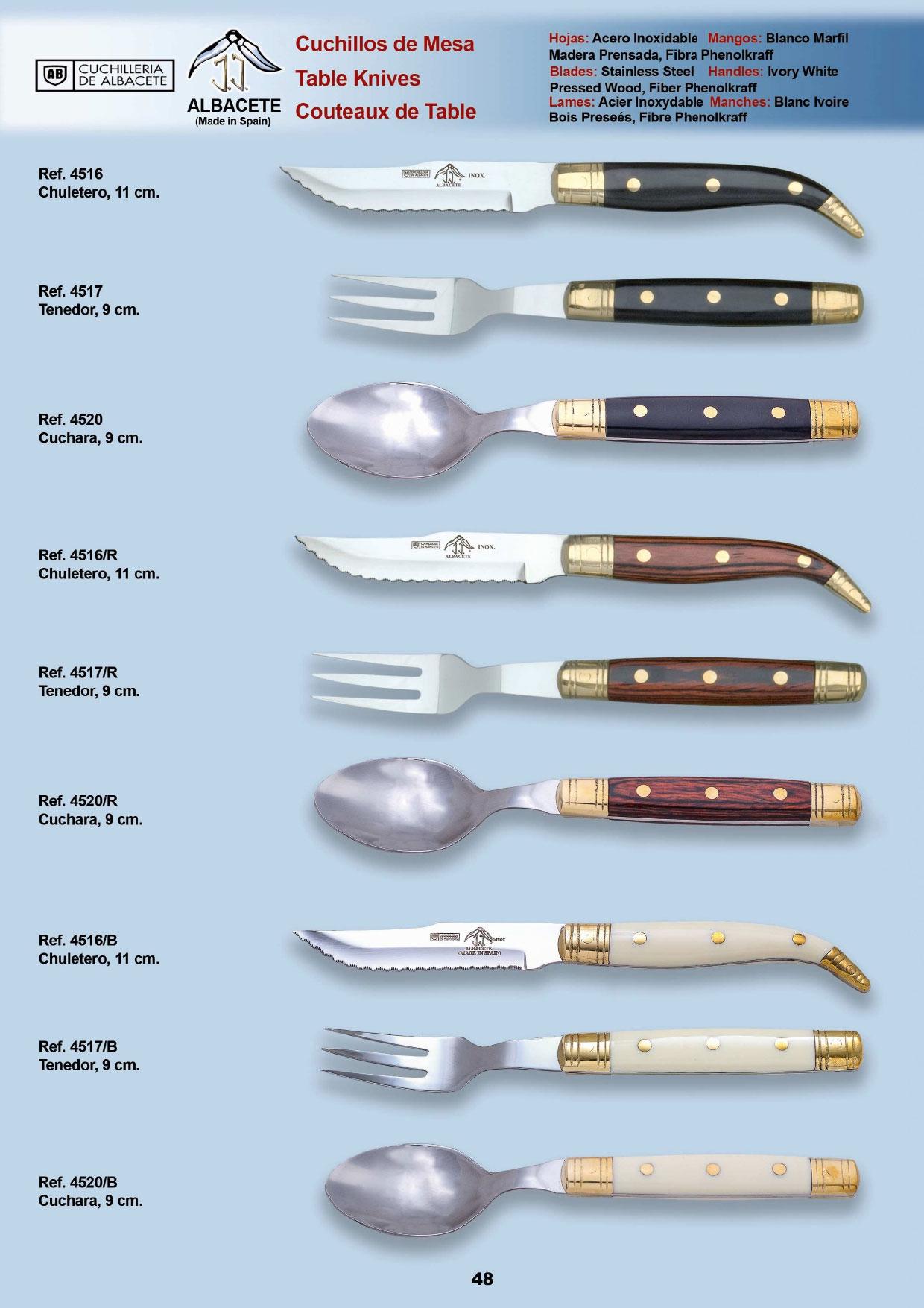 Cuchillos y tenedores de mesaHojas: Acero inoxidableMangos: Polioximetileno (POM), Madera prensada, Fibra Phenokraff, Madera comprimida.