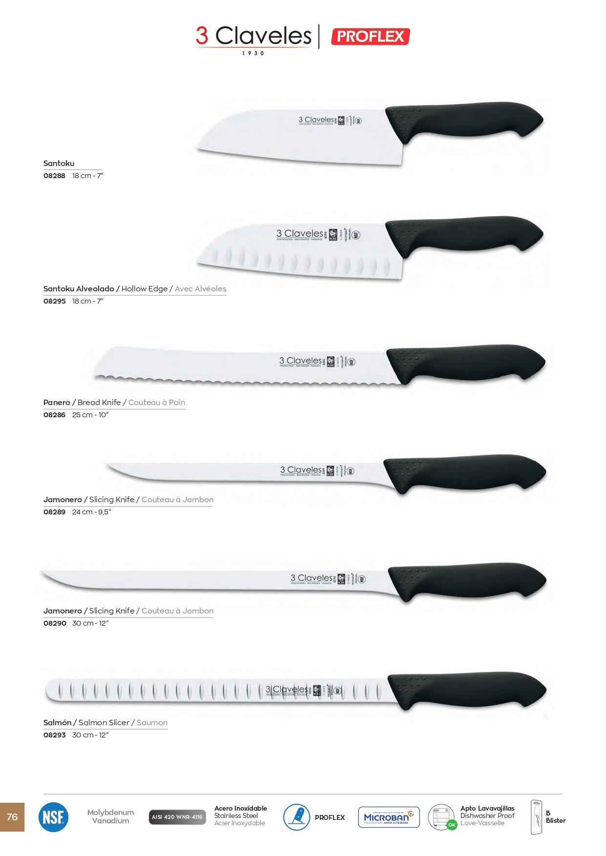 Cuchillos de cocina con hoja de acero inoxidable AISI 420 WNR 4116. Mango Prolex-Microban (material termoplástico de alta calidad unido a la tecnología antibacteriana del microban). Estable a altas y bajas temperaturas.