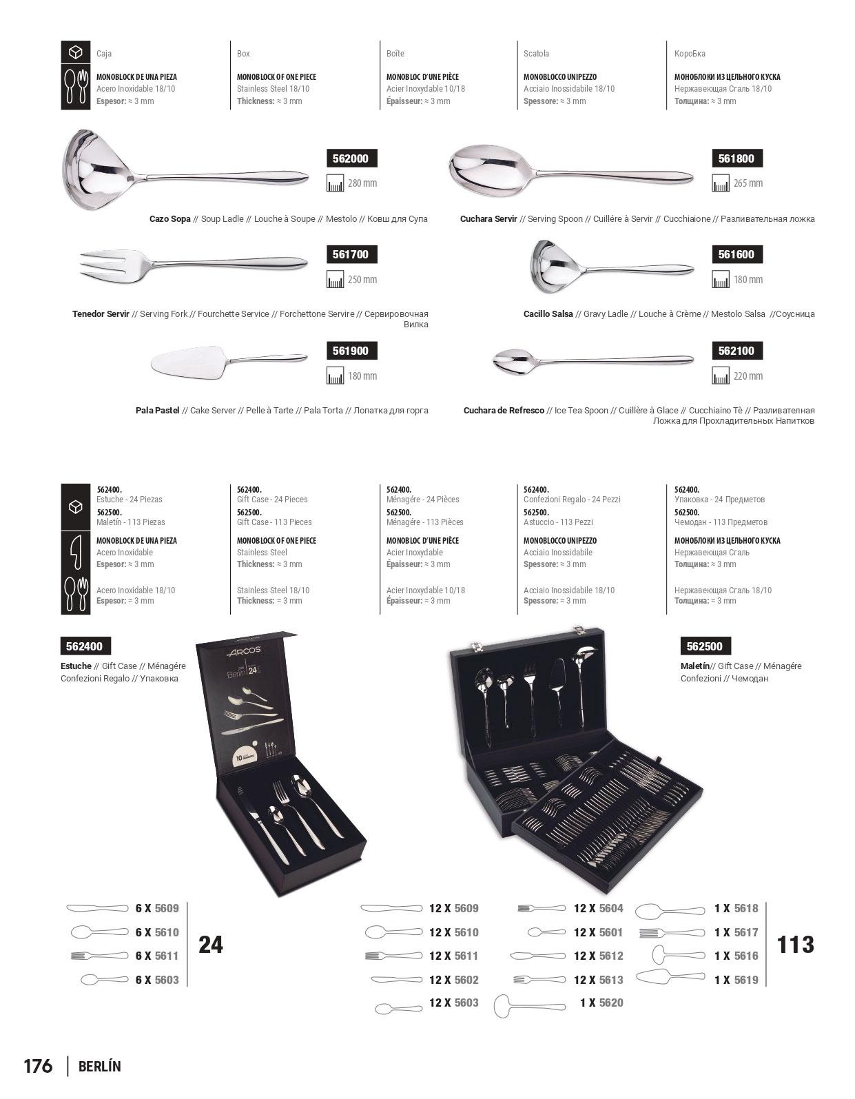 Cuberteria de 113 piezas. Monoblock de una pieza. Mango y hoja de acero inoxidable. Espesor 3 mm. Presentacion con maletin.