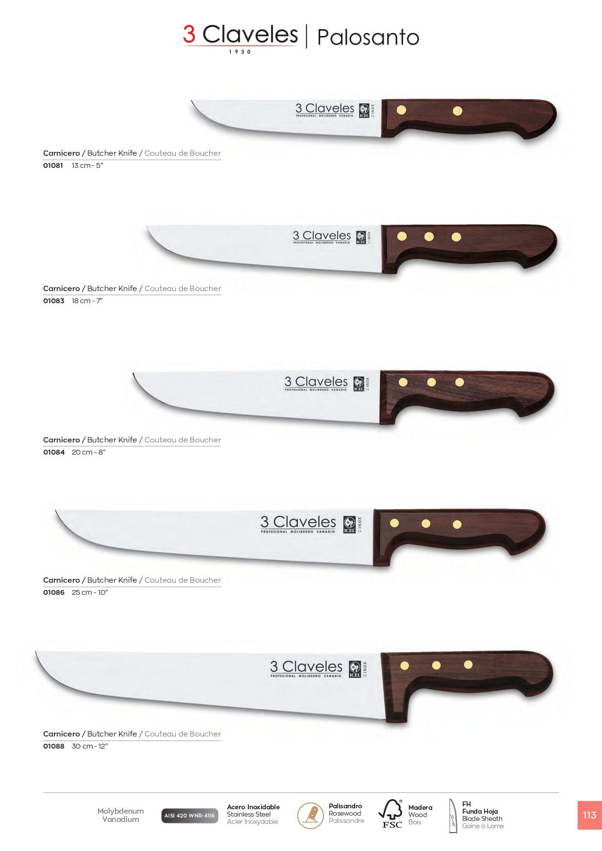 Cuchillo carnicero 30 cm con mango de palosanto 3 Claveles