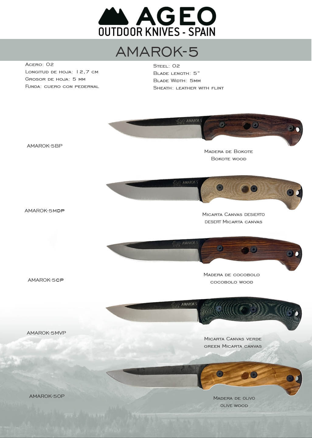 El cuchillo tiene una hoja de acero AISI O2, longitud de hoja12.7 cm (5") y grosor de 5 mm. Un hoja enteriza robusta y potente para acompañarte en tus salidas al campo. Con el cuchillo de supervivencia Ageo Amarok nada se te resistirá.