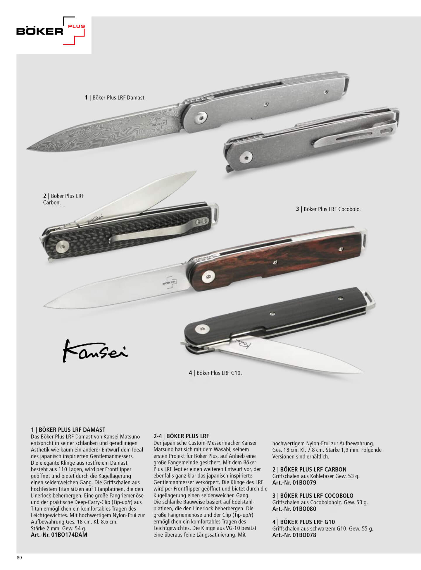 Navajas diseñadas por el fabricante japonés de cuchillos Kansei Matsuno. Presenta un diseño que también incorpora claramente el cuchillo de caballero de inspiración japonesa. La hoja del LRF se abre mediante una aleta delantera y ofrece un engranaje suave y sedoso debido a los rodamientos de bolas.