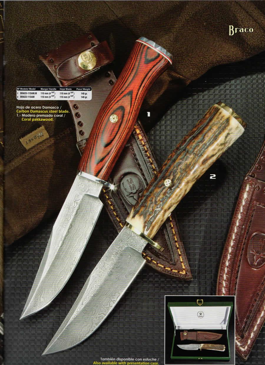 Hoja de acero damasco de 110 mm. de largo.Forjado a mano, hasta 576 laminas.Espesor de hoja: 4 mm.Empuñadura: asta de ciervo.Funda: cuero.Incluye estuche de presentacion.