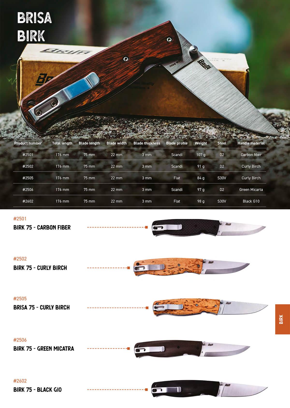 Disponible en diferentes materiales de mango: madera de abedul rizado, micarta verde, G10 negro o fibra de carbono.