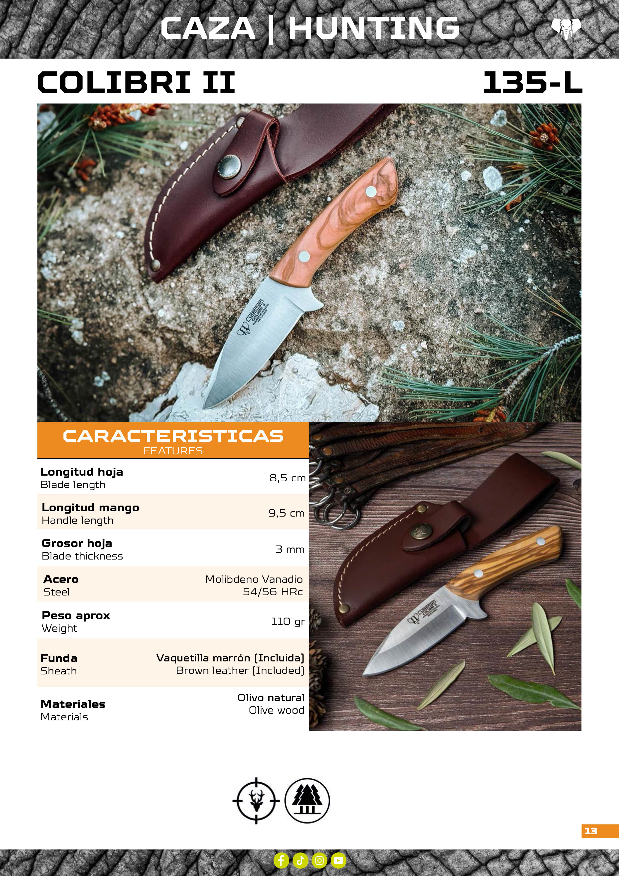 Cuchillo Desollador Colibri II con mango de madera de olivo y hoja de 8.50cm. Funda de cuero incluida.