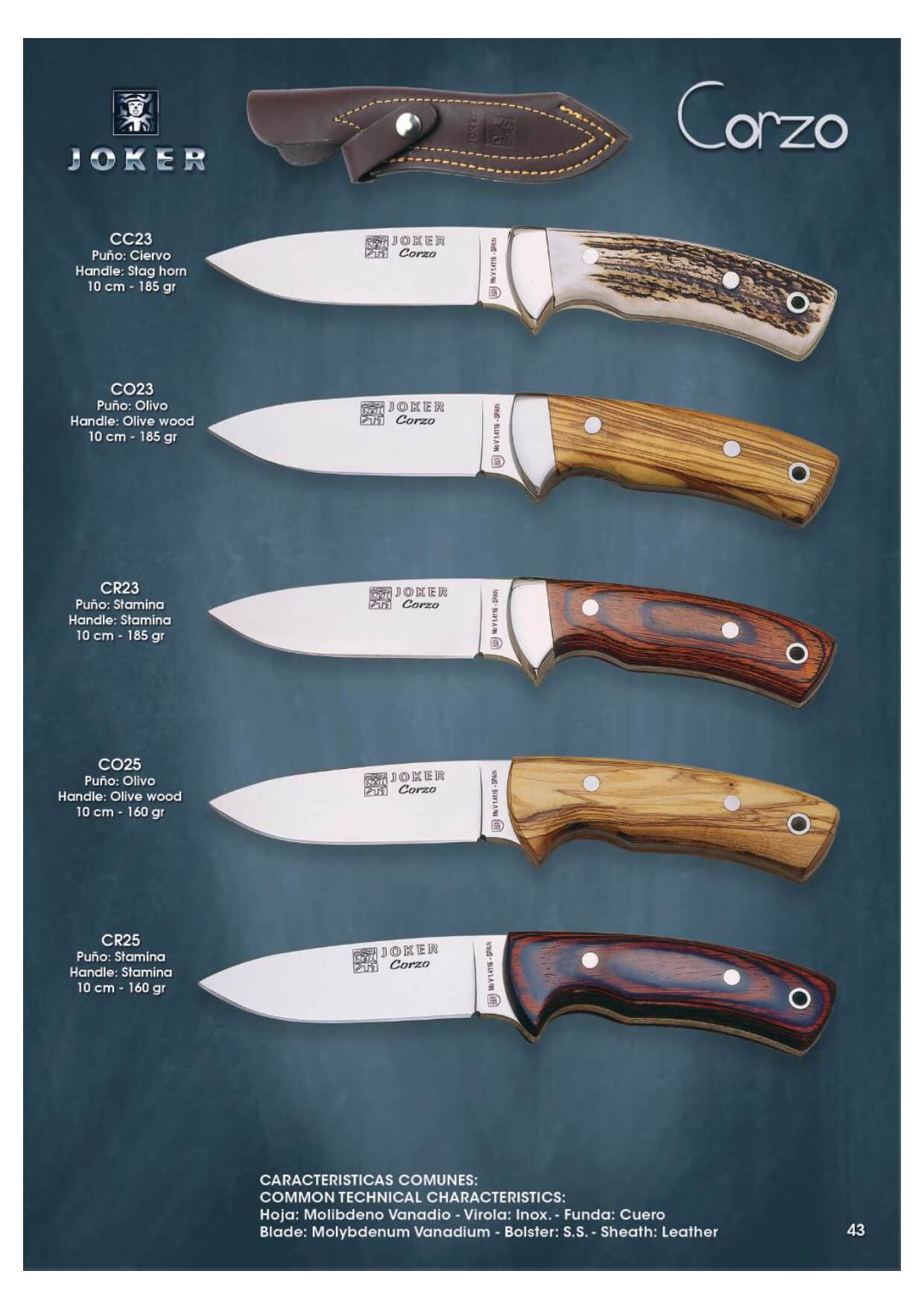 Mangos de asta de ciero, madera de olivo y estamina. Con agujero para cordón fiador y funda de cuero marrón.