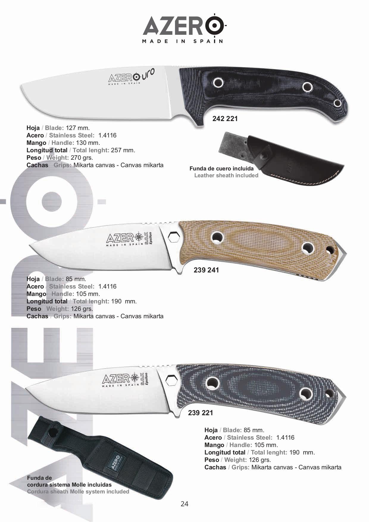 Cuchillo de supervivencia AZERO Epsilon 239221 y 239241. Se trata de un cuchillo en acero ACX-380 con mango de canvas Mikarta. Incluye funda de Cordura con sistema MOLLE.