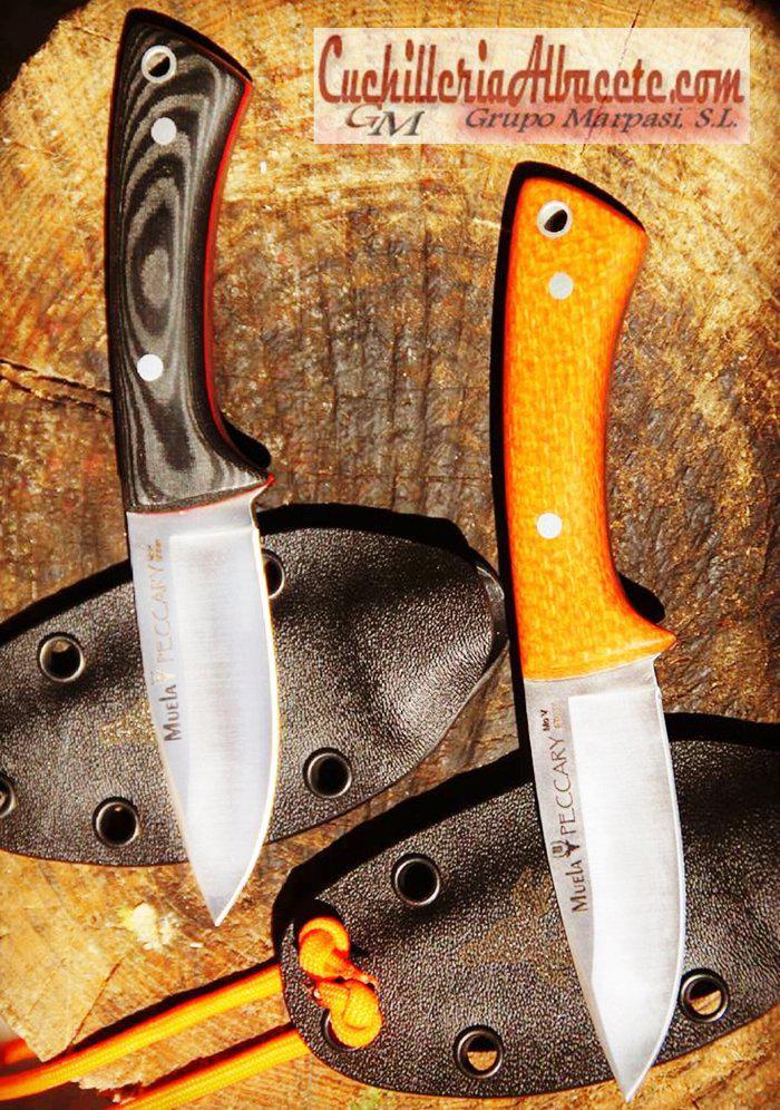 El cuchillo deportivo Muela PECCARY tiene una hoja enteriza, cachas en micarta negra y canvas naranja, funda de Kydex y cordón paracord de 550 lbs.
