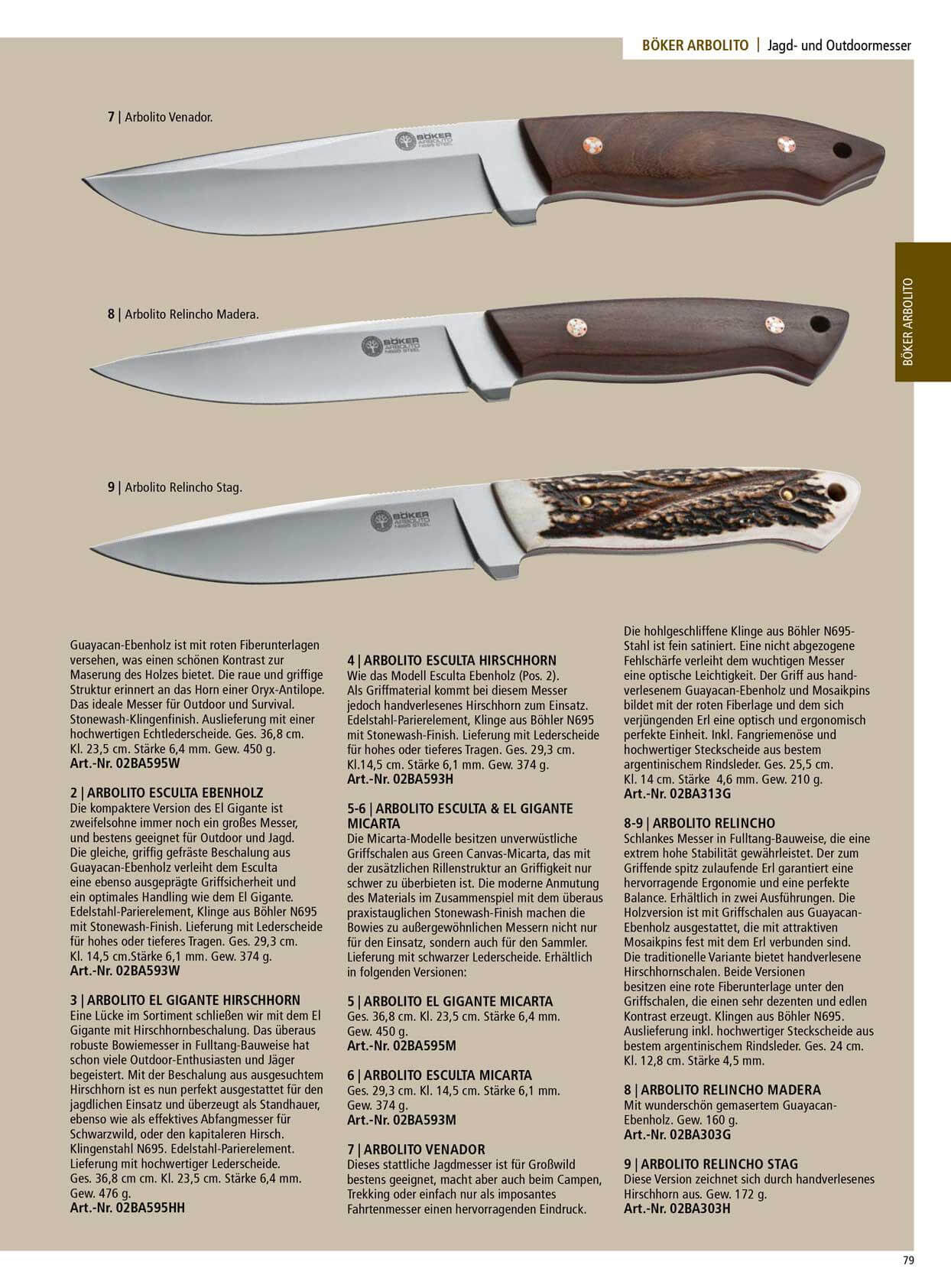 Mango cónico, de dos dos versiones. Versión madera de ébano con remates fijados al muelle y versión de ciervo. Ambos con una capa de fibra roja entre las cachas. Hoja de acero Bohler N695. Cuero de Vaca. Total de 24 cm. Cl 12,8 cm. Espesor 4,5 mm. Peso 160 g (versión madera)/peso 172 g (versión ciervo).