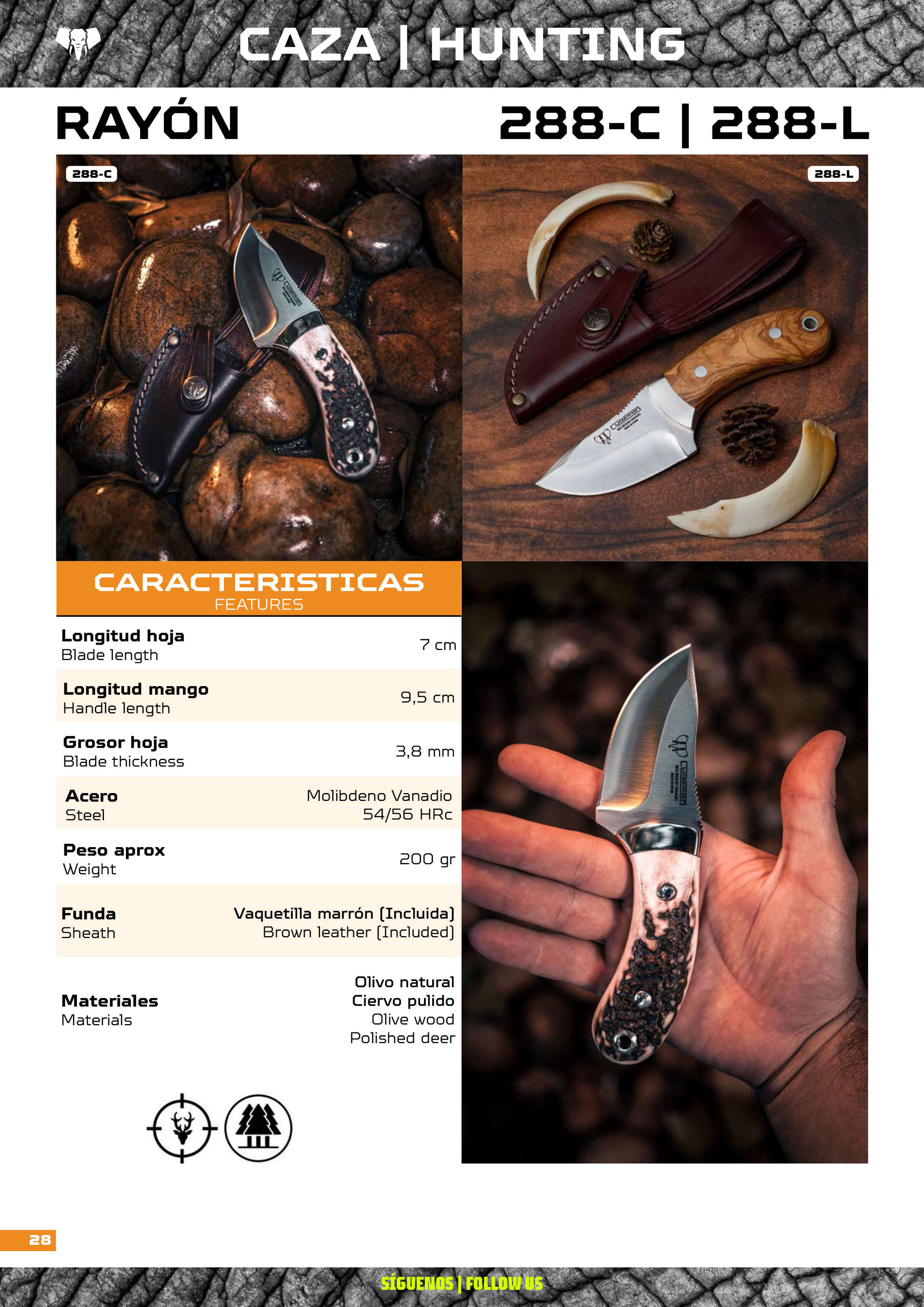 288: Longitud de hoja: 7.5 cm. Longitud total: 17 cm. Grosor de la hoja: 4 mm, ancho de pala: 4 cm. Hoja con vaciado concavo. Funda de cuero incluida.