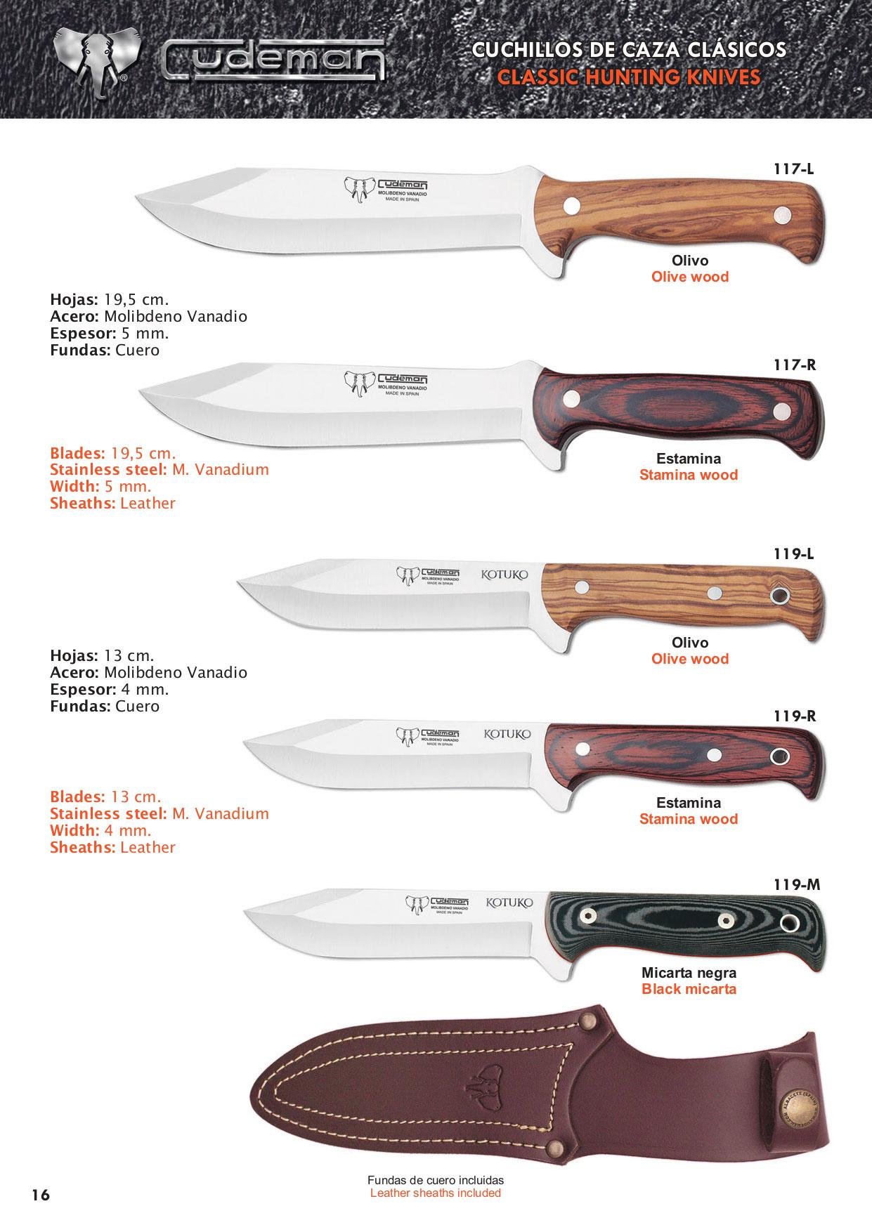 117: Cuchillo enterizo con hoja de acero Molibdeno vanadio. Longitud de hoja: 19.5 cm, longitud total: 33 cm. Grosor de la hoja: 5 mm. Ancho de pala 4 cm. Hoja con vaciado cóncavo y punta drop-point. Funda de cuero marrón incluida.