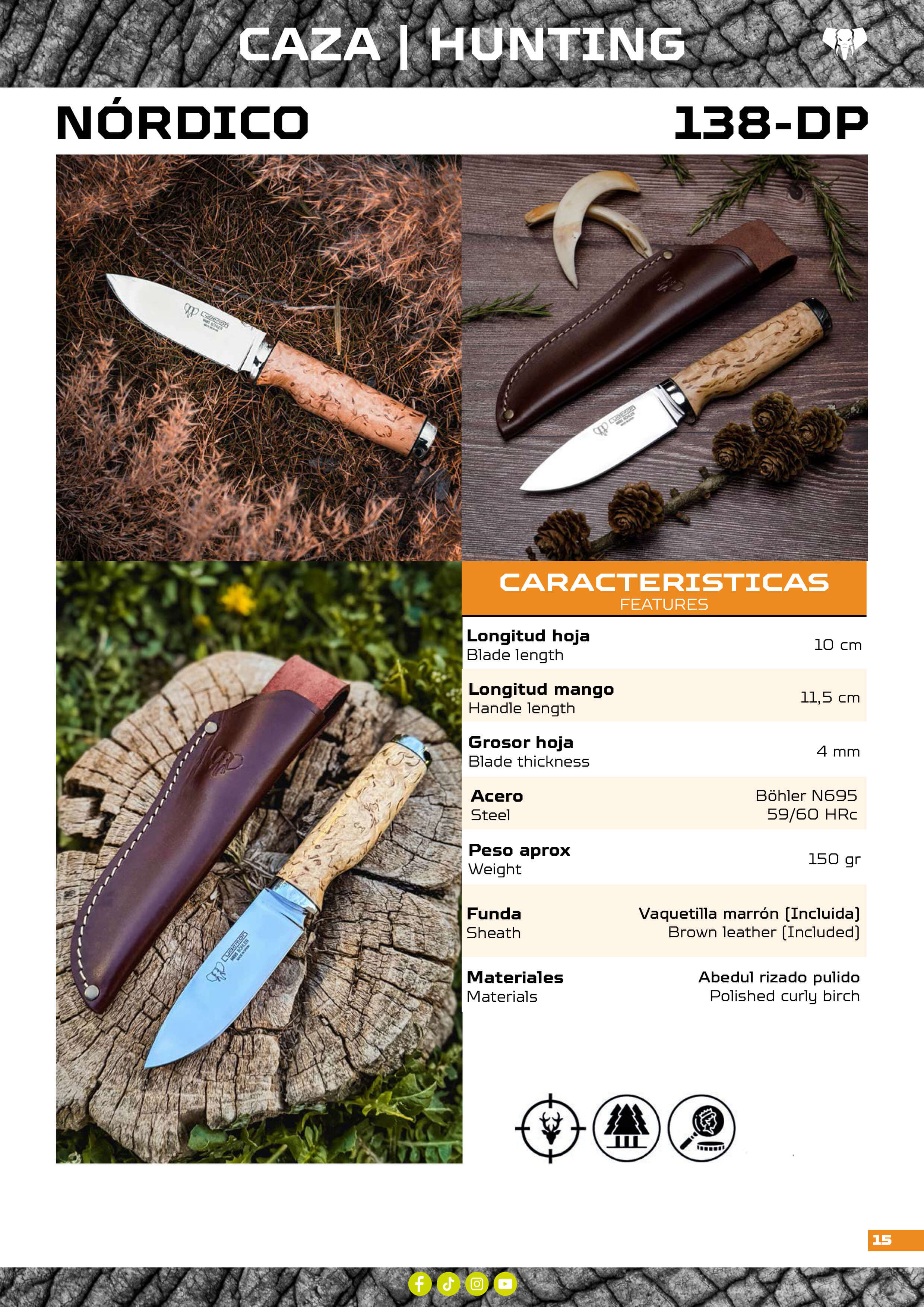 Serie 138Cuchillo de supervivencia con mango de madera de abedul rizado, con acabado pulido. Fabricado con acero Böhler N-695, incluye funda de piel.