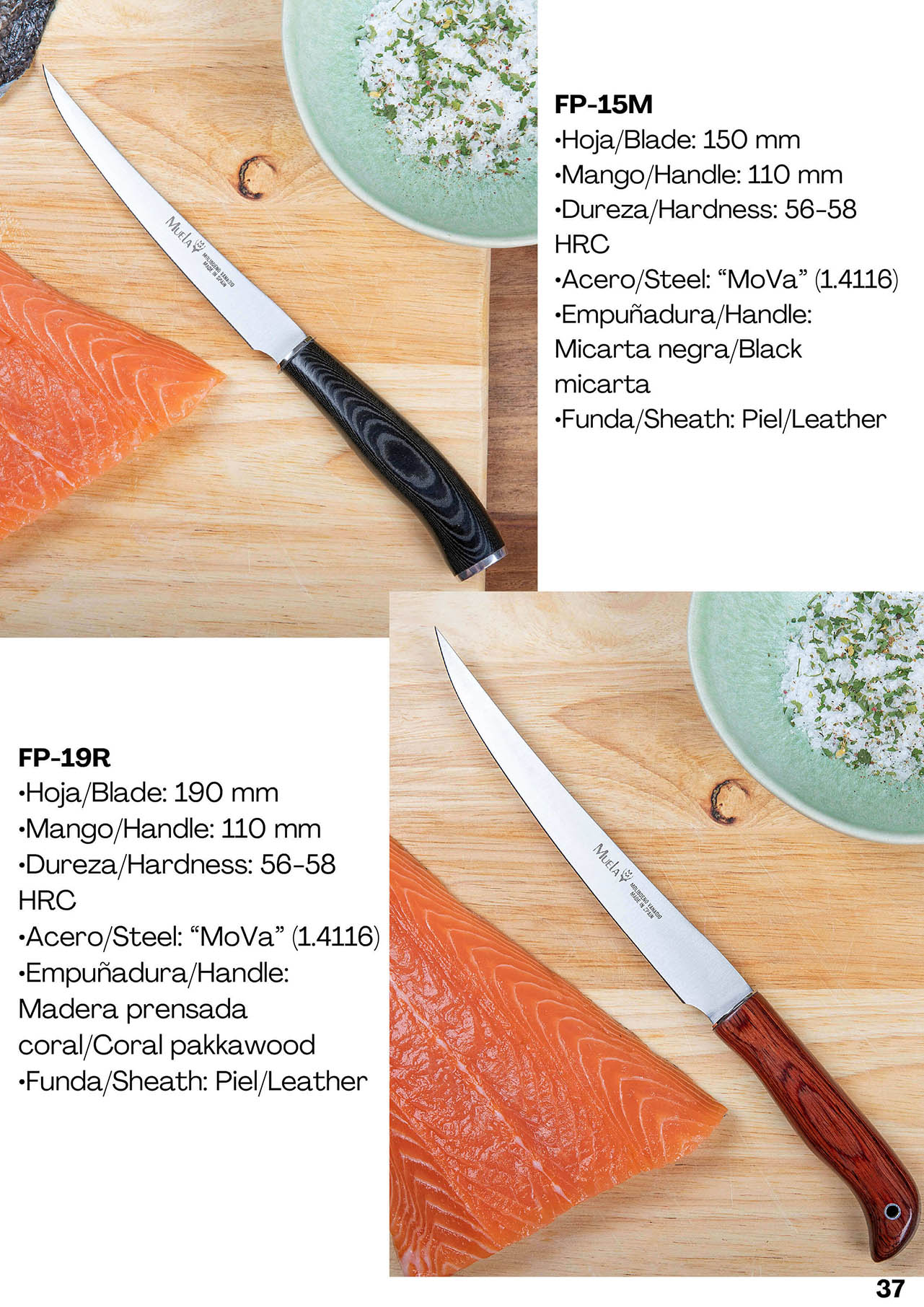 Cuchillo de filetear con hoja de acero MoVa 1.4116 con una dureza de 56-58 HRc. Con funda de piel.