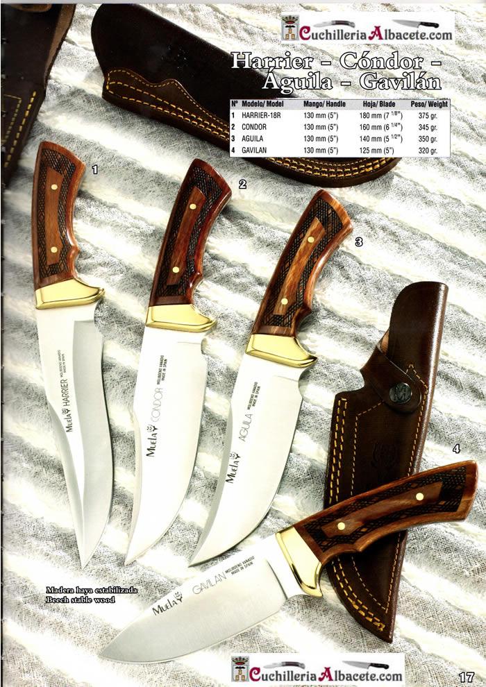 Cuchillos de caza de hoja enteriza, cachas de madera grabada y latón