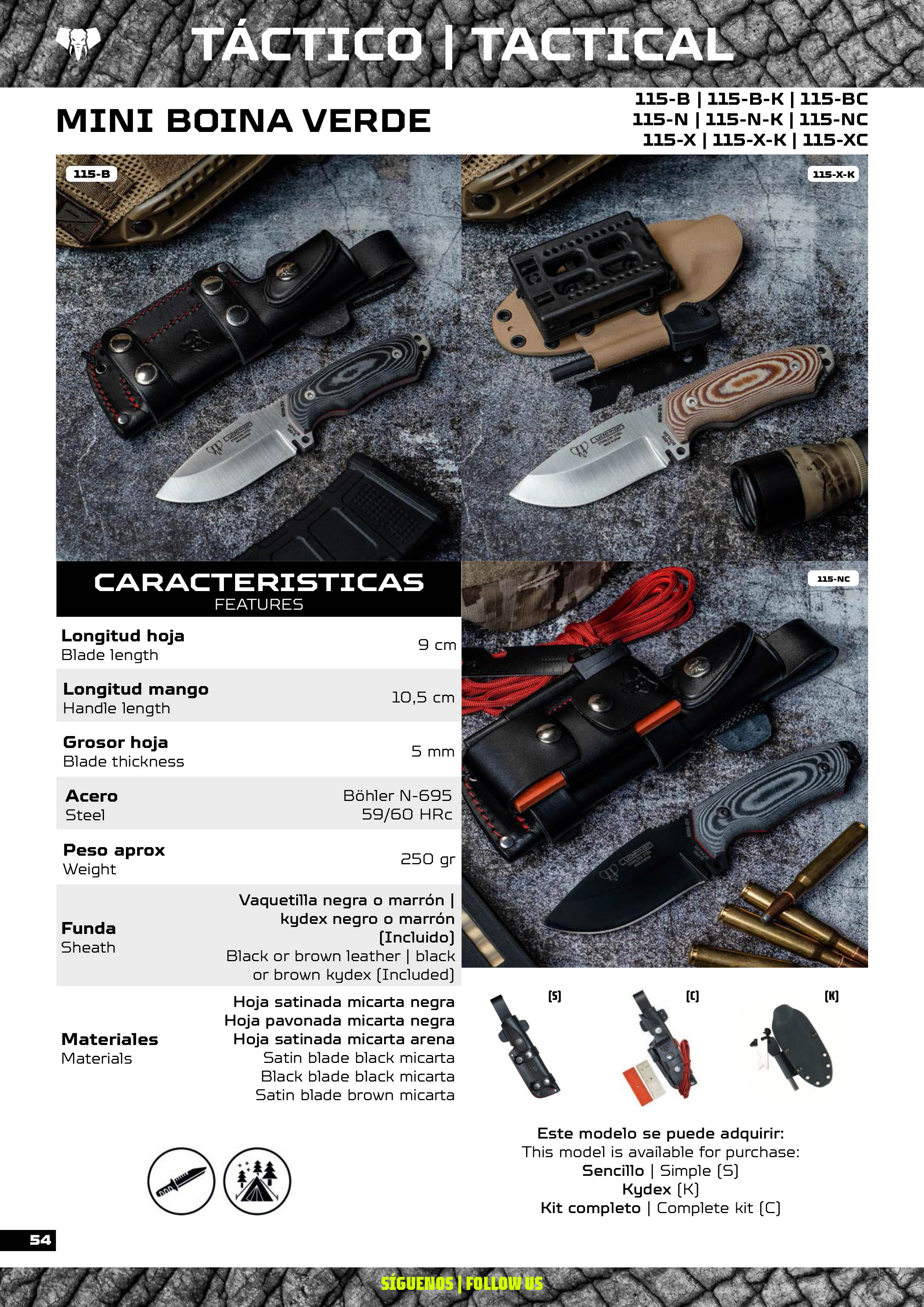 Cuchillo enterizo con cachas de micarta de distintos colores. Hoja de acero Böhler N-695 o MOVA. Longitud de hoja: 9 cm. Longitud de mango: 10.5 cm. Longitud total: 19.5 cm. Grosor de hoja: 5.33 mm. Ancho de pala: 4 cm. Hoja: vaciado cóncavo. Acabado de hoja: satinado. Punta de la hoja: Drop-Point. Peso cuchillo: 266 gr. Agujero para cordón fiador. Rompe cristales. Rompe alambres. Cremallera en la hoja para mejorar el agarre. Incluye funda de cuero negro o marrón (según el mango).