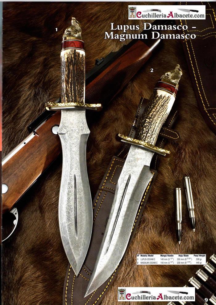 Cuchillos artesanos de Acero de damasco, puño de asta de ciervo y madera Rosewood. Con estuche.