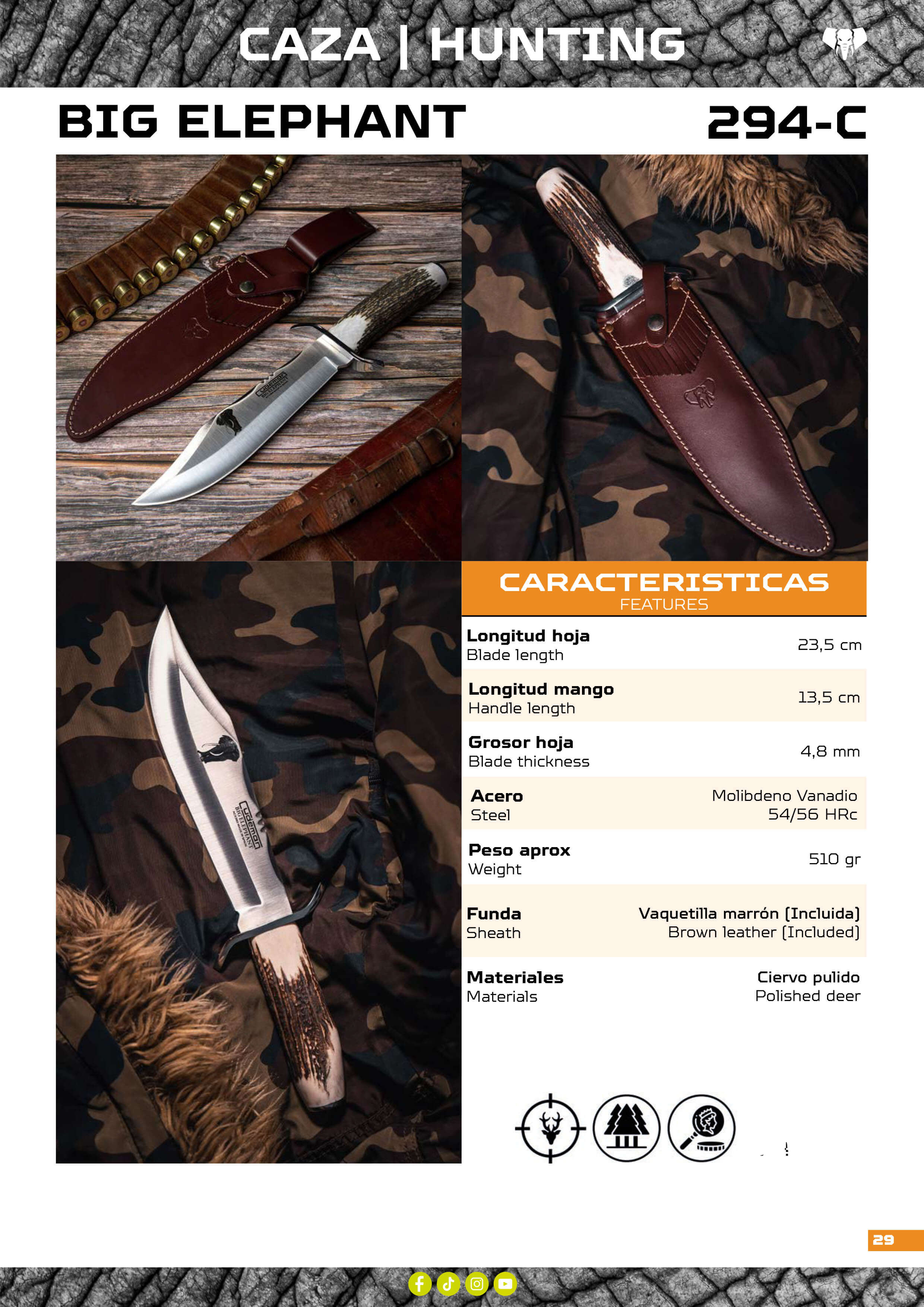 Cuchillo de caza con punta de tipo Bowie y hoja de Molibdeno Vanadio de 5 mm de espesor. Con mango de asta de ciervo y hoja de 23,5 cm de longitud. Cruceta es de acero 420. Incluye una funda de cuero.