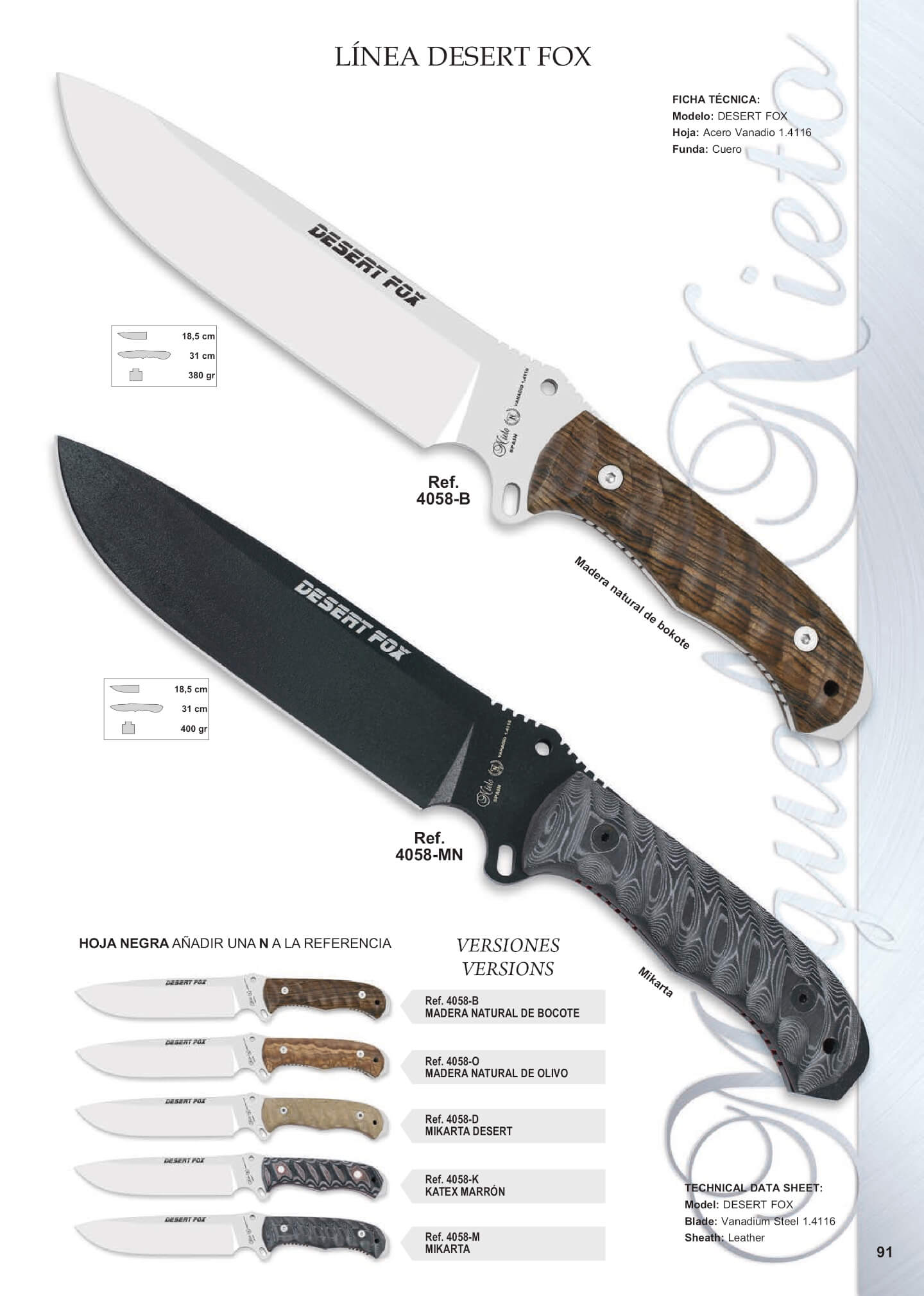 Cuchillo bushcraft Nieto Desert Fox con hoja enteriza de acero Vanadio 1.4116 de 18.5 cm. Un cuchillo táctico con una longitud total de 31 cm.