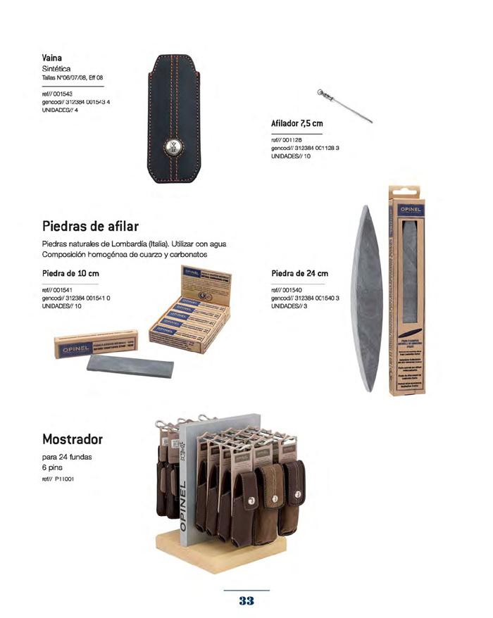 FUNDAS Y ACCESORIOS OPINEL. 001543 Vaina sintética. Tallas Nº 06/07/08, Eff 08. 001128 Afilador 7.5 cm. Piedras de afilar. 001541 Piedra de 10 cm. Presentación en caja de cartón. 001837 Piedra de 10 cm. Presentación en blister. 001540 Piedra de 24 cm.